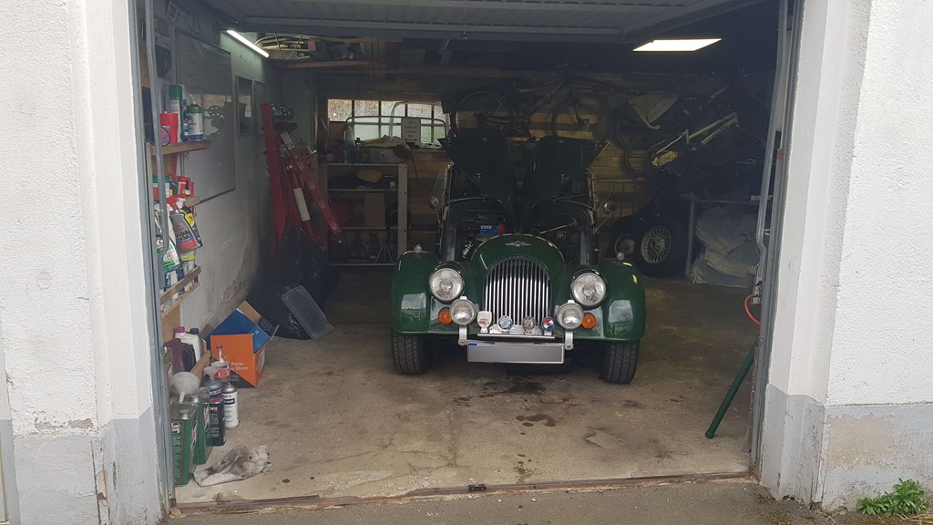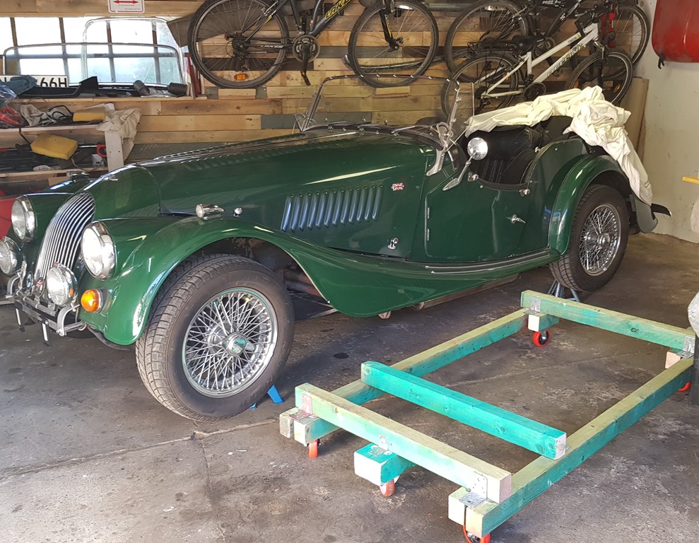 On inspection the four spark plugs looked interesting: two of them were oily, one pitch black, one completely white. The other side of the engine was covered in oil. Although I am not entirely sure but it looked like it came out of the PCV valve. I already knew that the front suspension needed attention. Brakes, steering, dampers as well as the King pins are on the todo list. So the plan at this point was to remove the front, remove the suspension and engine. Since the Mini also must be parked in the garage it quickly put together a rolling jig. Yes – it is made of wood, but the Morgan just weighs around 800kg and it works just fine. This allows me to move the Morgan into the back corner of the garage – and can be pulled out when I need to work on it.