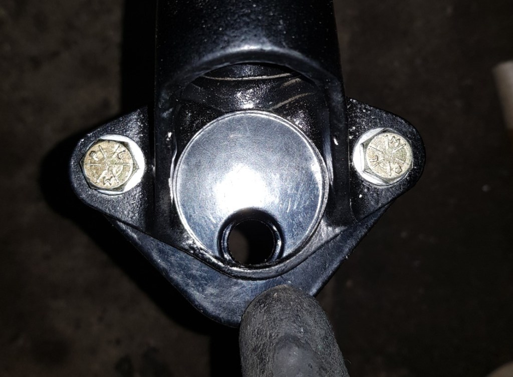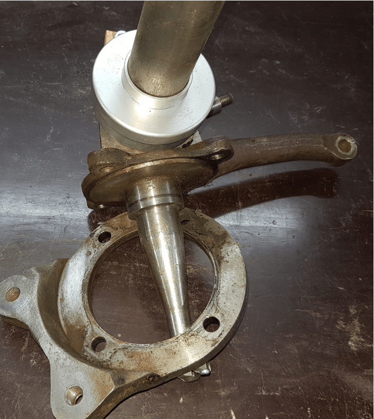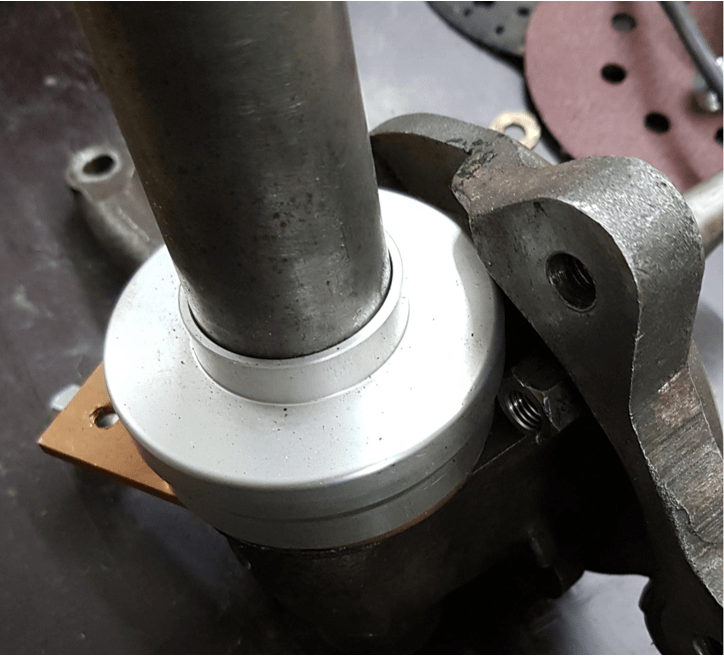 Now the issue I ran into while doing the test fit was the steering roller bearing. This only fits on my stub axle if I remove the brake caliper mounting bracket. Something I tried to avoid as I knew that the bolts are “secured in a distinct way” as the three dots on the end of the bolt clearly show. There are different views on if steering roller bearings make sense – especially on a Morgan 4/4. It will take a while until I can comment on this – for now I have them and therefore somewhat shorter springs and there is not turning back. The bolts are UNF with a hex head – not easy to get on a Friday afternoon in Germany – thankfully Tim from NewElms is so kind to send me a new set including nylocs via mail.