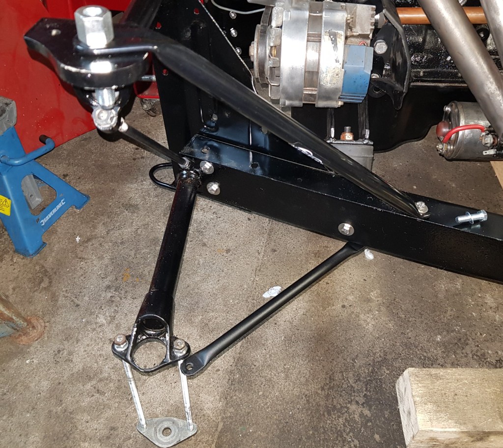 What initially wasn’t clear to me is that to fit the negative camber plates I must cut a piece out of the bottom crosshead. It becomes dead obvious when the negative camber plate is screwed onto the crosshead. I also understand now that Tim from NewElms is right about the track rod – it must be extended when using negative camber plates. I decided to ditch this plan for now.