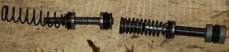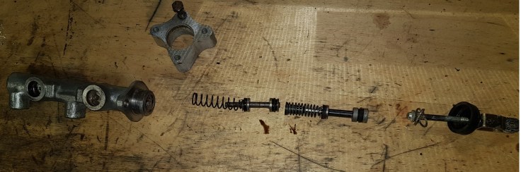 Getting the secondary piston out of the Girling was a bit tricky because I didn’t have a compressor at hand. I used a magnet attached to a pen and was able to pull it out very slowly. Afterwards I cleaned all parts in a new Ultrasonic cleaner I bought. I cut some 120 grid sanding paper into small strips and taped them as flaps to a wooden stick that was slightly smaller as the bore of the Girling. A few turns with the battery powered drill cleared the surface rust insight. Putting the new seals in and everything back together was a simple task.