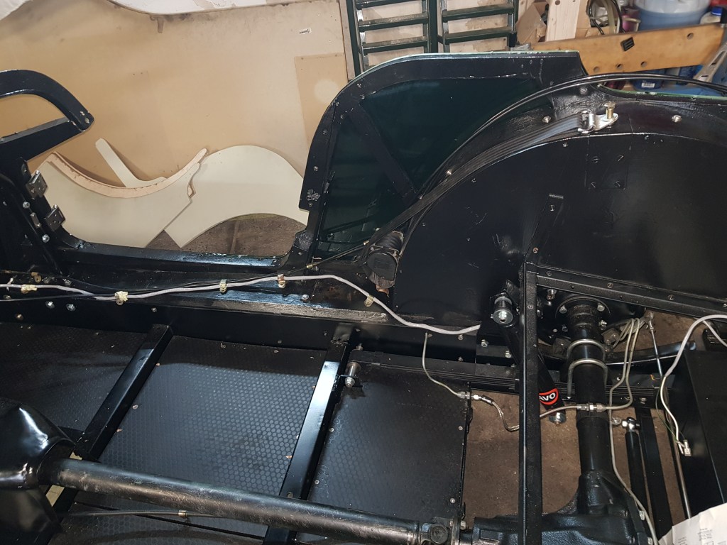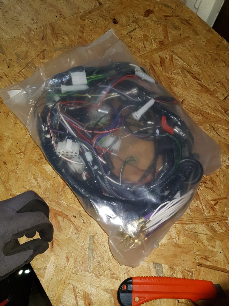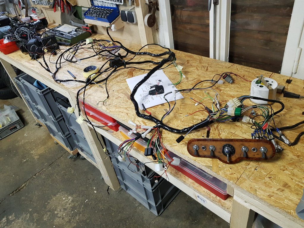 The new wiring loom finally arrived. As mentioned before AutoSparks did not send it to the updated address and Billy Bellinger was so kind to forward it. The new long (and freshly cleaned up) workbench was helpful for this task. After I unpacked the box, I decided to revisit the old loom again. The rear part looked easier to start off with. In addition, the fuel lines are attached to the same clips and I want to get this in first.