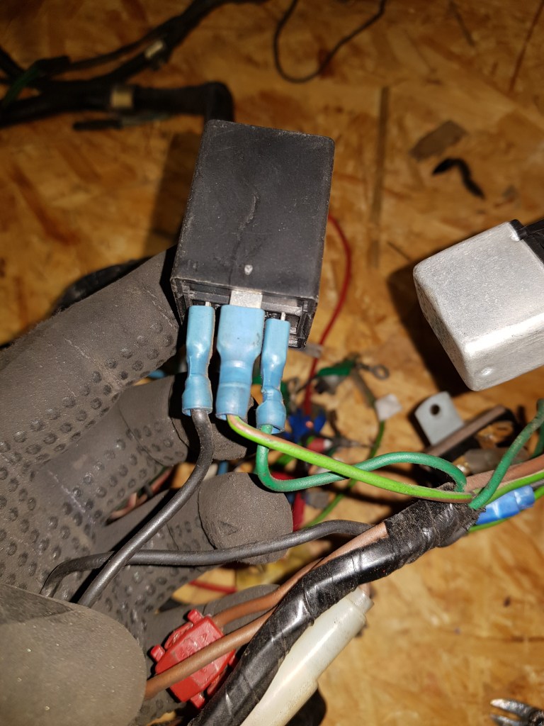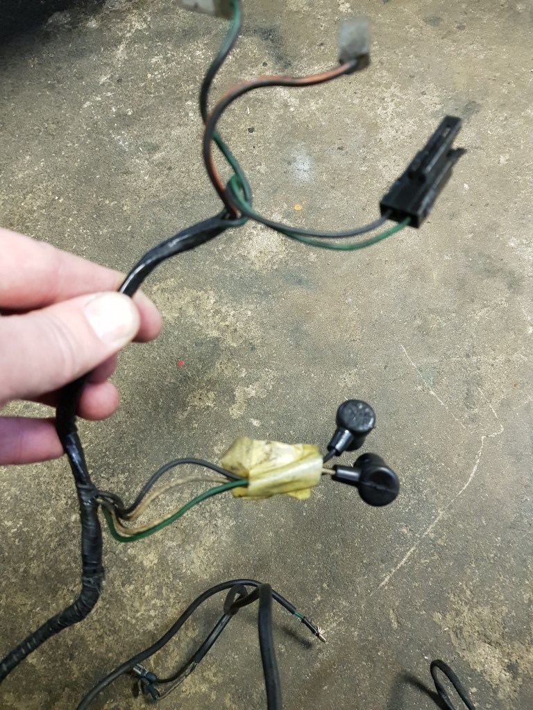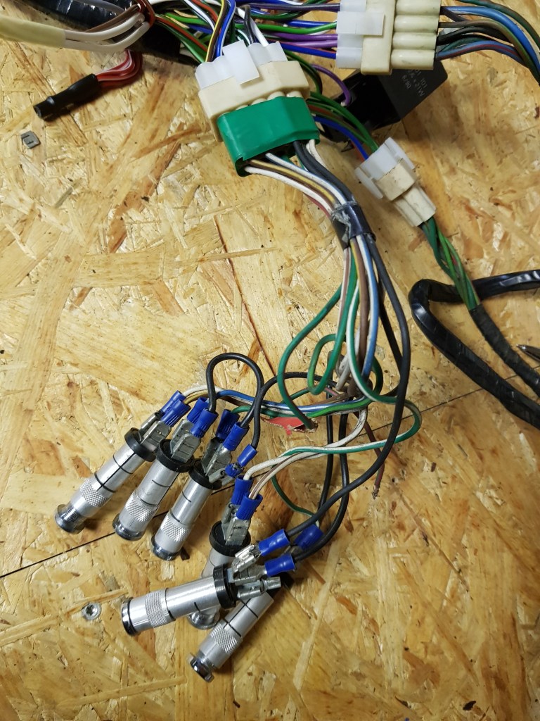 After stripping off a couple wires from the old rear loom that have been attached at some point I laid out the old and new pieces next to each other. While it is very close to the original rear loom it lacks the junctions and cable that ran just in front of the passenger seat (right side in my car) to the gearbox tunnel. On the plus side it has a white-purple cable running all the way to the connector to the fuel tank. The BS-AU7 British Standard Colour Code | Autosparks color coding says this is for the fuel pump. This is good because the new Facet pump will be installed somewhere close to the tank. For whatever reason the old one was attached to the bulkhead. The main loom however does not have the pin connected for the pump. But this can be added along with the Inertia switch I want to install.
