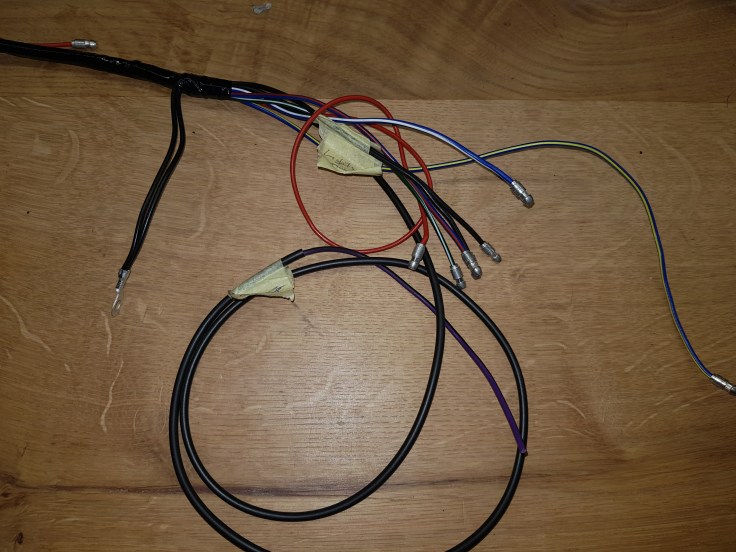 The side lamp cable as well as the rheostat to dim the instrument lights should be connected via a fuse and a red-black cable. The AutoSpark loom lacks red-black for this – instead all red cables are connected. I need to sort this out. The rear loom has a white-purple cable (fuel-pump) but it is missing the the main loom. Not a big problem – I will add an Inertia switch and a connection to the fusebox for this.