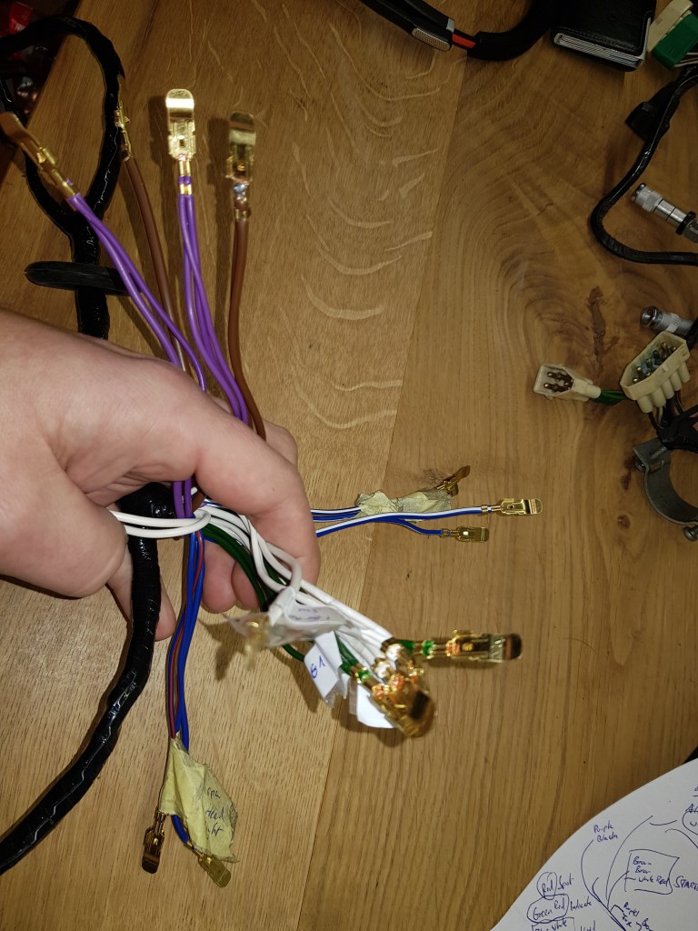 - Number 1: Brown (N) is the main battery feed. All purple cables run of from that one. The two other brown cables run to the ignition and light switch.