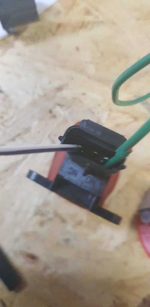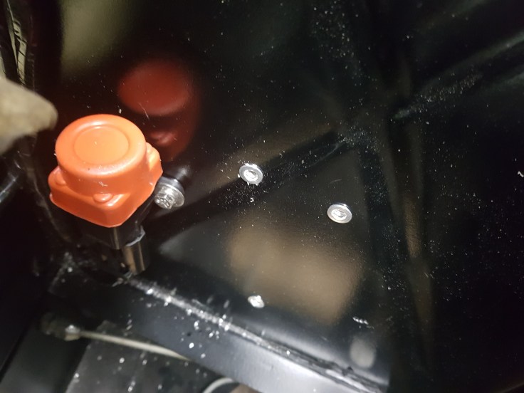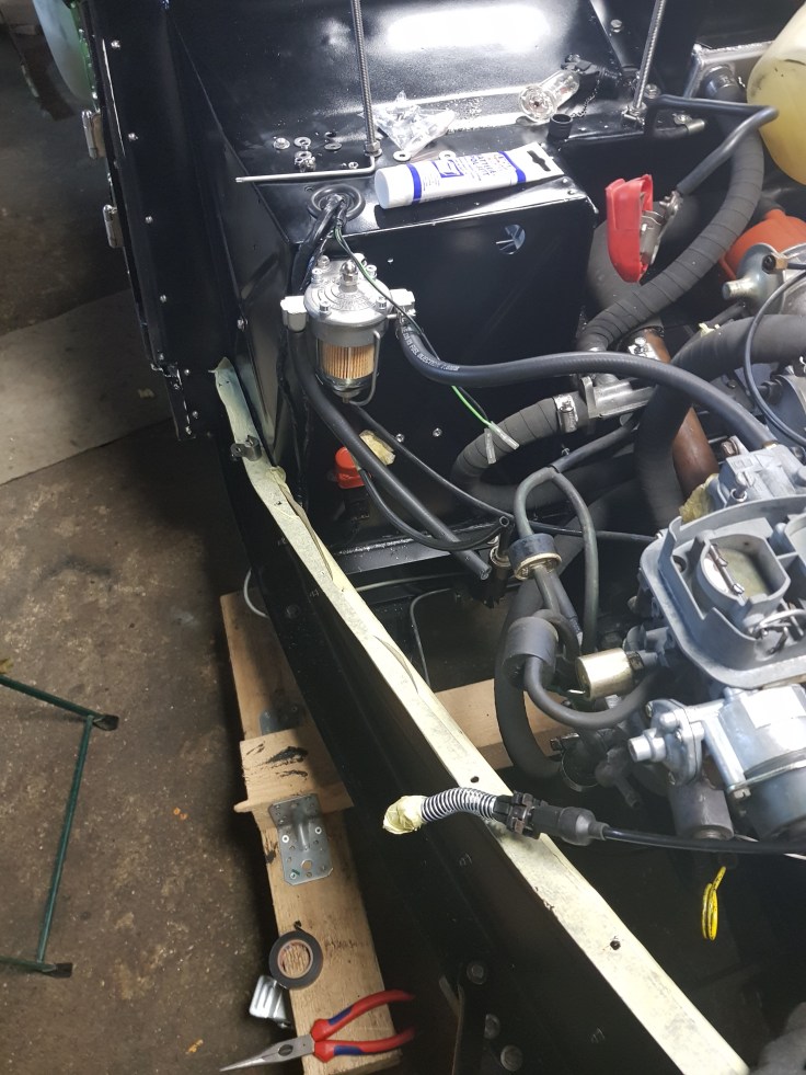 I also cleaned up the wiring from the coil to the distributor and inserted rivet nuts to screw done all cable holders. On the right side of the car I had to extend almost all cables. As mentioned before the entire loom could be 10 cm longers on the right side. For now I have just soldered on pieces for the washer pump as well as the idle solenoid and auto-choke. The cables for the indicators and lights just stick out from the inner wing. If I am lucky I don’t need to extend those. The new Inertia switch is not screwed next to the washer bottle. While it came with just two cables connected – the pin in the middle gets power if the there is a fault. I added a cable in the loom for a new inertia control light because I concerned that it might be triggered by bumpy roads to easily. I can always remove it and replace it with a manual fuel pump switch on the dashboard.
