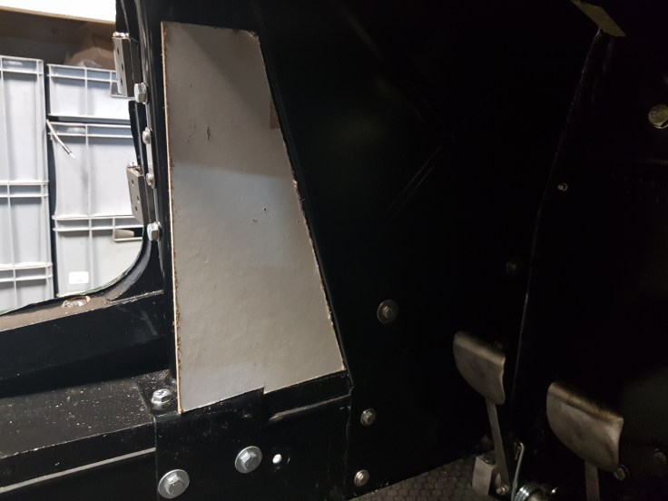 In the meantime I can prepare a piece of multiplex board as cover between the bulkhead and the scuttle anti-rollbar. The will be covered with carpet later which I intend to fix with velcro on the roll-bar and wrap around it. There is a tiny space at the botton which is big enough for 8cm large speakers I happen to have. On the passenger/right side it will also cover up the connectors for the rear harness which will behind it.