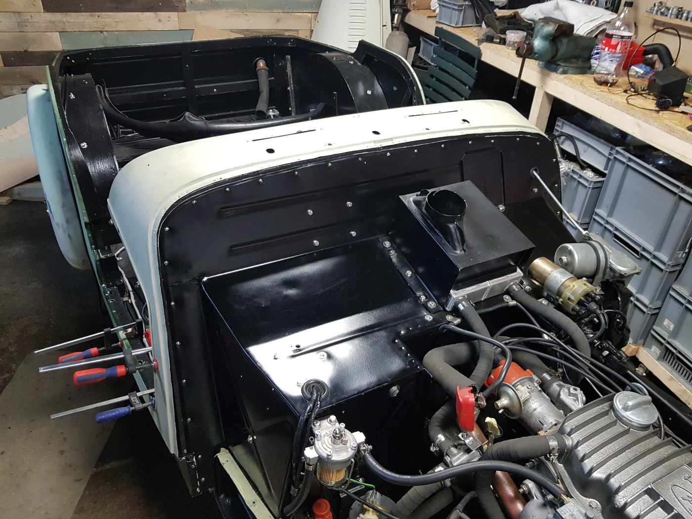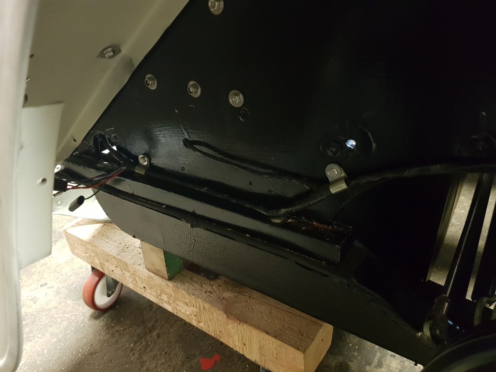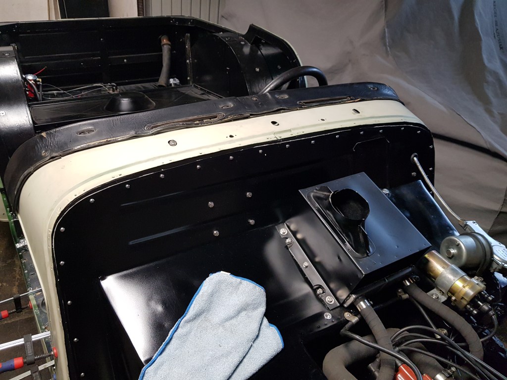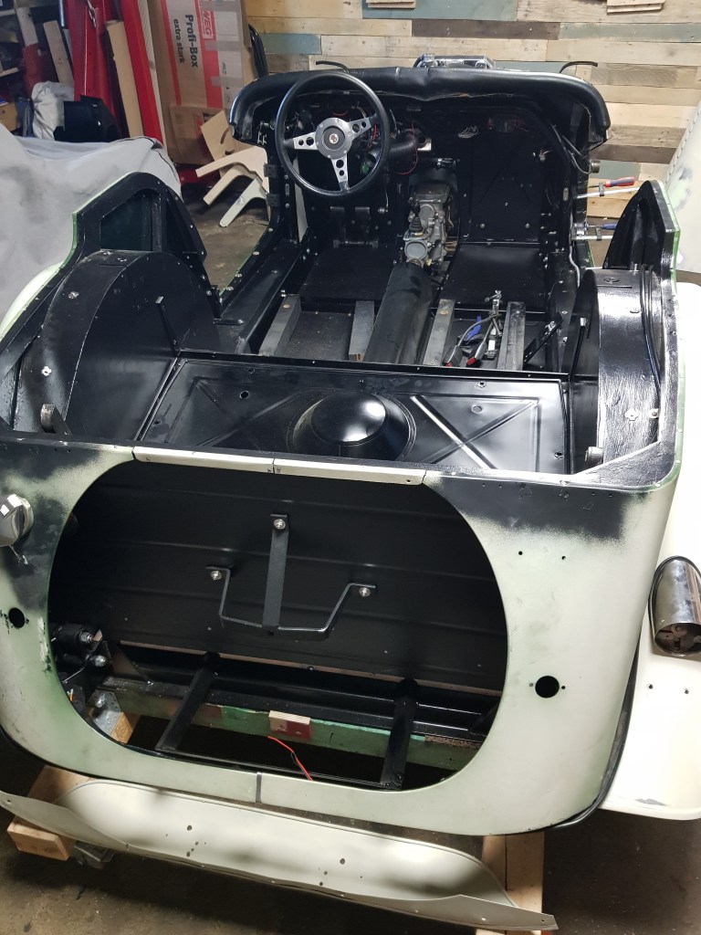 In order to get a feeling of accomplishment I then went on to fix up the rear wiring harness. Autosparks used a grey PVC warp for this part and I didn’t like this. So I added another layer of black tape and attached the loom back to the car. The rear number plate panel is made out of metal, needs a bit of welding and straighting. As I need to order some more parts, I am now tempted to replace it with an aluminium one…