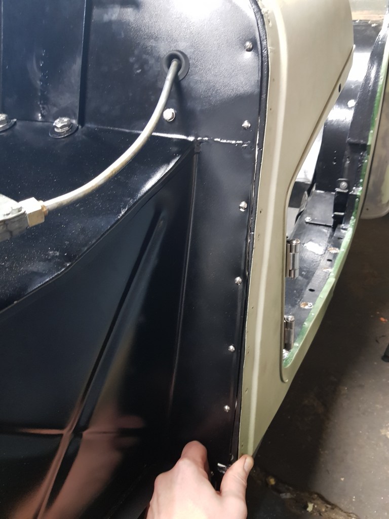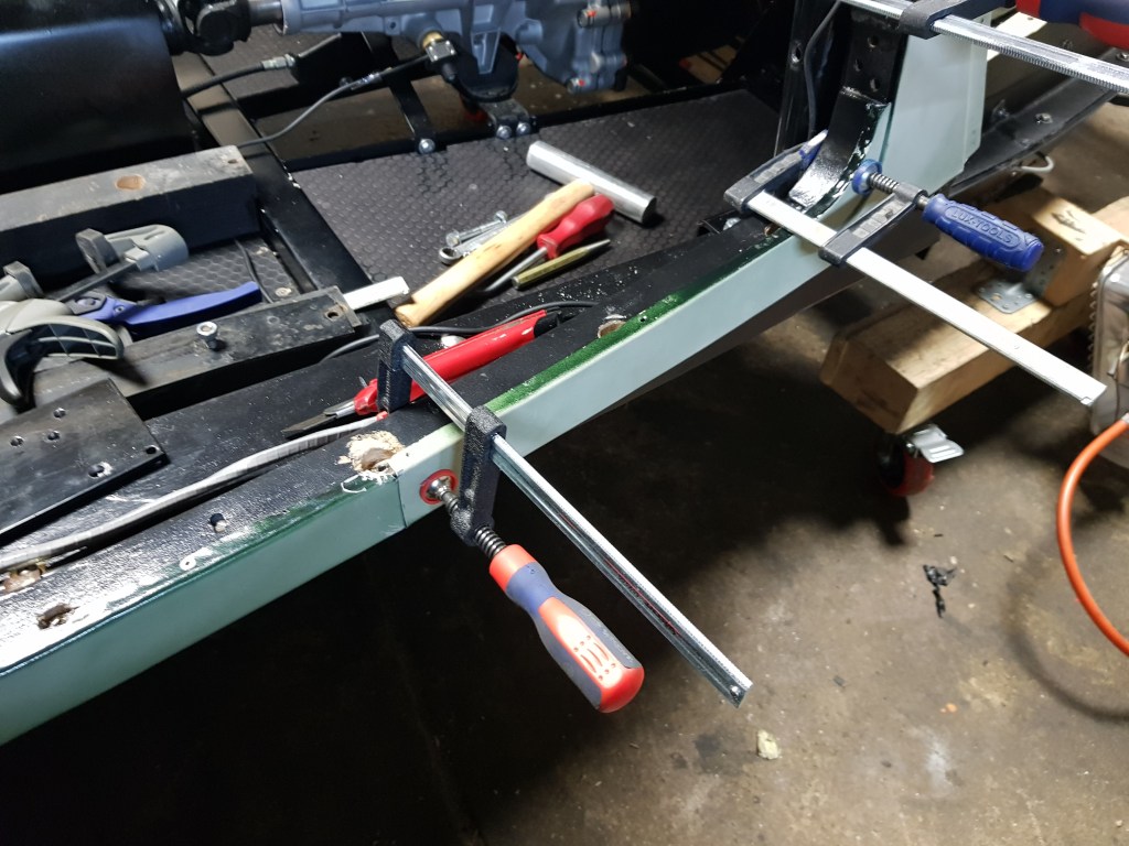 But no matter how I tried to get it one – the lower corner one the right/off-side just doesn’t go around the wood. It is one maybe two millimeters to short. With the help of some loosly attached clamps the part of the scuttle beneath the door does fit. I asked Stefan (the owner of the body and paint shop) to take a look at it tomorrow – maybe he has an idea what I could do better.