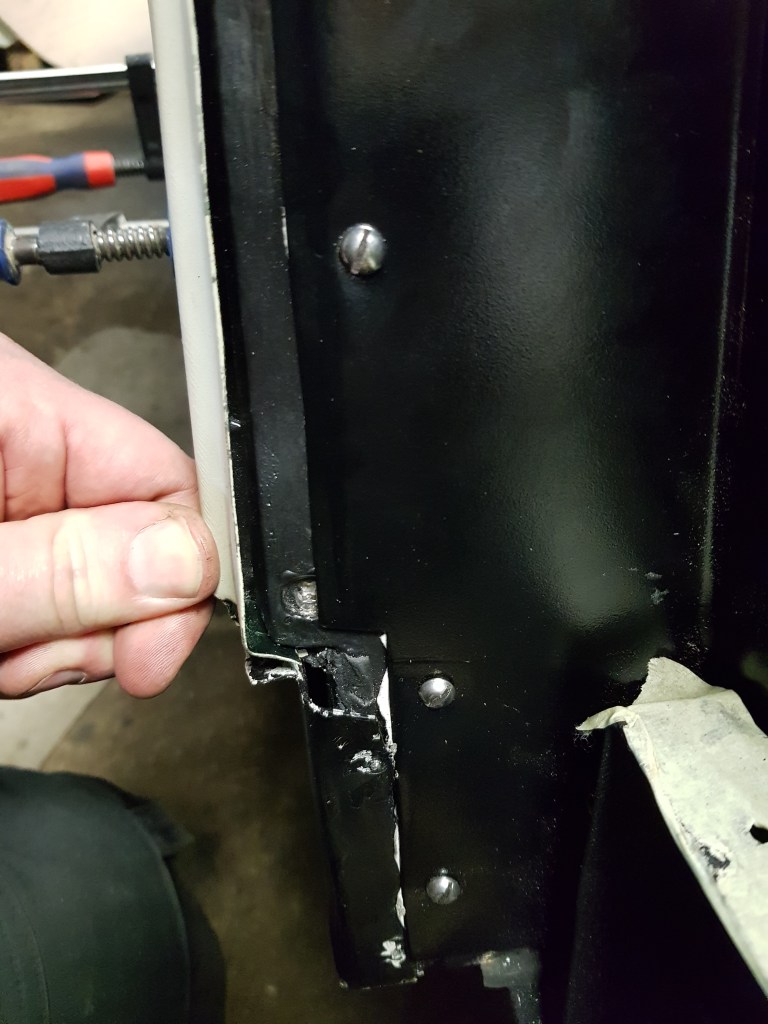 So I was quite frustrated this weekend that this did not work out right away. And much to my surprise it is the right/off-side of the car that causes trouble. The better part of the evening went into trying get the fitment right. I started off with checking that the middle aligns correctly. There is an indent in the wood for the rear bonnet hinge and it is important that this location is correct. As there was a crack in panel this part was welded a while ago. Next I made sure that both sides end up correctly on the upper part of the hinge post. There is a small hole where a rubber stop used to be and I used that as reference.