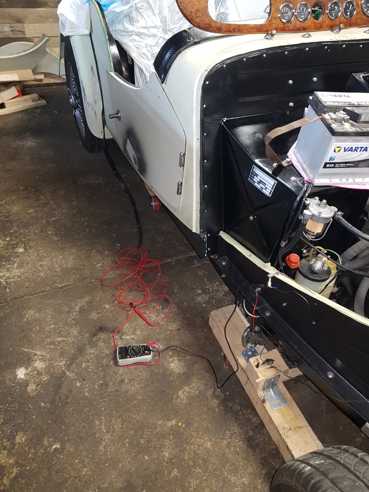 Also great – the car is on its own wheels now again. We even rolled it out of the garage when my wife and daughter visited me with the MGB to take a “family picture”. While doing this I noticed that the drivers-door still needs adjustment. It sags now after I tightened up all hinge screws ago. Besides adding a shim between the lower hinge and the door there is not much I can do. This was on my task list for today – after checking all electrical circuits. When I had the wiring harness on my desk – each cable connection was measured a couple of times. Another check was made after the loom was installed.