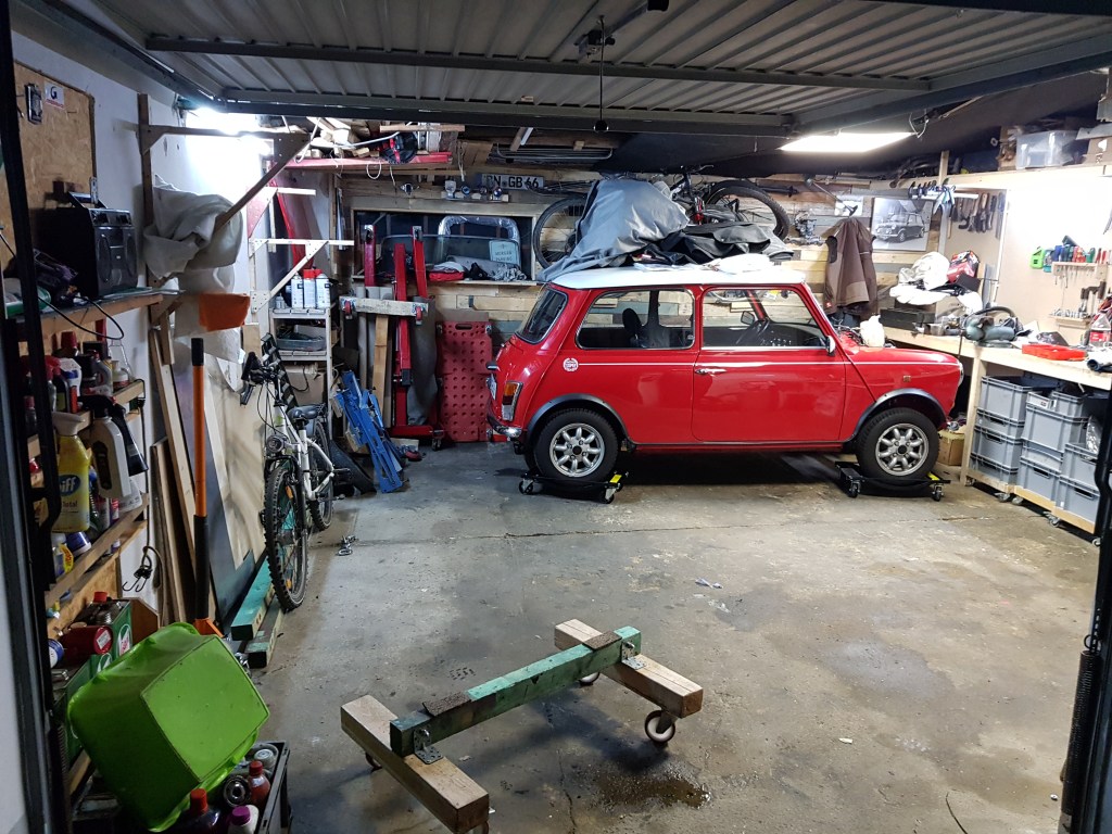 My work schedule has been quite packed and intense after my vacation. Therefore, I didn’t spend any time in the garage until tonight after removing the engine last Friday evening. The cunning plan was to move the Mini to the right back corner of the garage – with the front under the workbench. When I built the bench, I measured the height of the Mini and thought that the 85cm would just fit. Turns out – with the engine removed and the Mini on new car dollies – there is not enough clearance. The easiest solution would be to deflate the tires – but it would also not be very good for the wheels. Taking the wheels of and putting the mini on different castors a second option. Adjusting the height of the workbench might be the most difficult option….