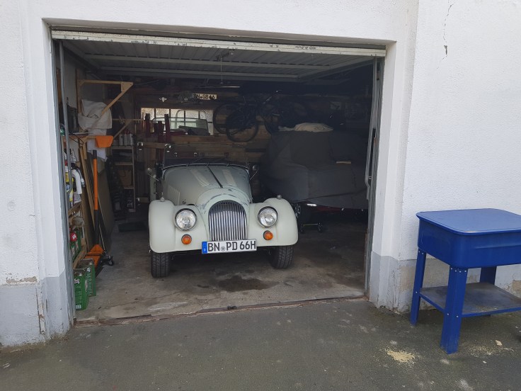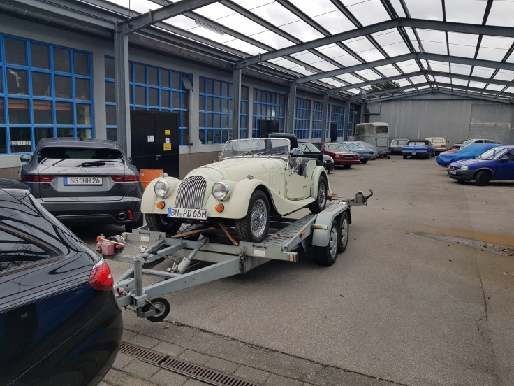 For the most part the technical inspection was a success. Nevertheless, I ended up getting a trailer as the car had to get moved out the garage in Solingen today. First thing that came to my mind when I picked up the car is that it looks great. Sure – there is just primer on all panels, interior needs to be done, chrome needs to be polished. In short – there still is a lot to do. But, it was the first time I was proud to have gotton so far with the Morgan restore. Even the traffic jam around the A59 bridge construction could not have an impact on my smile – while a Justin Timberlake song plays the line “take it to the bridge” on the radio…