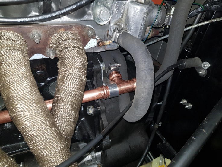 While the new cooper pipe shown below works great with the wider hose clamps β the end of the pipe is also a bit longer and close to the bulkhead. This caused a too heavy bending radius for the heater hose. My solution was to shorten the cooper pipe on the other end β moving the T-connector closer to the engine β which in turn required a new bracket to attach the cooper pipe to the engine. If you run into this situation β take a look at this thread on the TalkMorgan forum. The hose clamp posted by an author called βimageβ over there would have been a way easier solutionβ¦