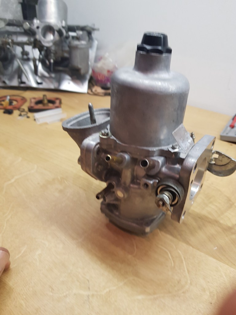 But since I just filled up my ultrasonic cleaner last week with the last bit of SKSonic VR and an original SU HIF44 service kit at hand – I just went ahead and took it apart completely. The design differences (e.g. choke, float, vaporization) between the SU and Weber carbs are remarkable. Both will do there their job, but especially when looking at the little booklet that comes with the service kit – I understand why a lot of MGB owners recommend sticking with the SU carbs. The instructions are good and easy to follow. It seems easier to adjust and tune. Overall the entire rebuild took me 3 hours (including 30min in the Ultrasonic which I used for a drink). The result looks good – I hope it will perform as good.