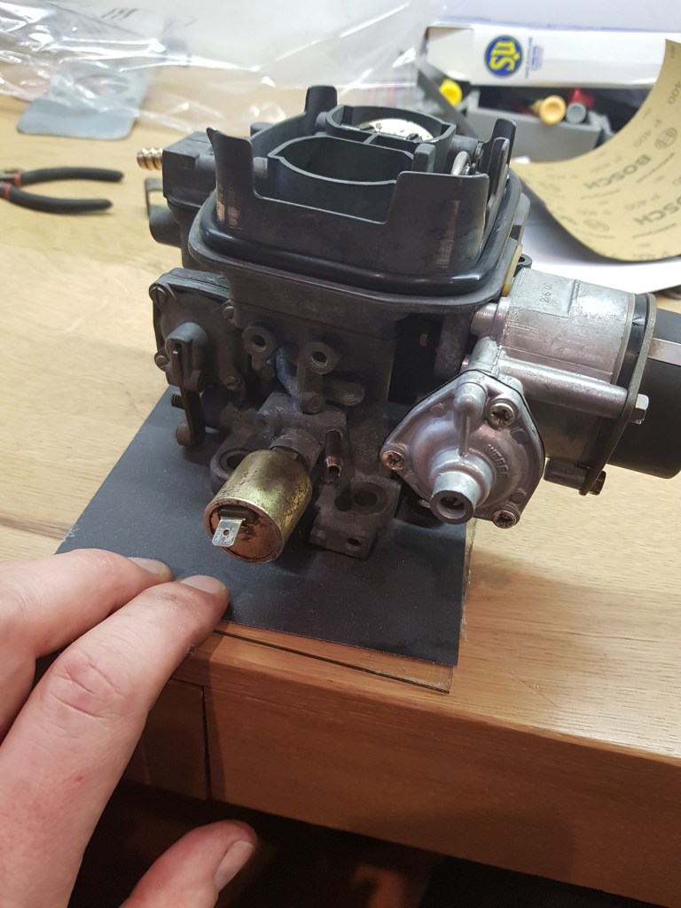 Something I should have done during the rebuild of the Weber is to sand down the bottom side of the carb to make sure no “false air” gets through the gasket. I had 400er grid sandpaper but needed a super flat surface. A quick check with my wife: “Honey, do you still want our wedding picture on the windowsill???” – provided the glass of a picture frame to get the job done. Back at the garage I also added heat resistant silicon sealant on both gaskets bakelite spacer beneath the heatshield. But this change didn’t fix the problem. The next logical thing was to check the distributor and timing.