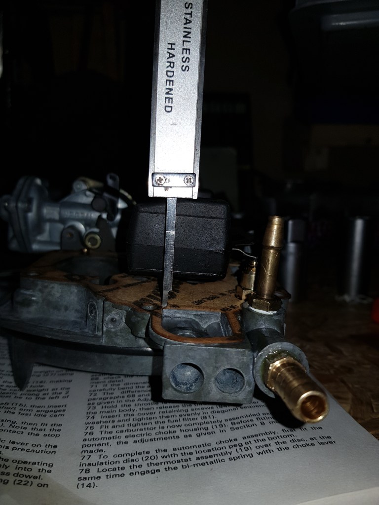 I watched it a couple of times and somehow had the feeling that is the root problem. As I replaced the needle seat and needle, cleaned the components a couple of times and made sure that the needle holds pressure (also explained very well in the video) – the only thing left was the float height. The Ford Escort Xr3 (due to the CVH engine the Morgan has) manual states “Float height – 34.5 to 35.5 mm”. And with the Video from D3Sshooter I checked this with the carburetor top part laying flat on my bench.