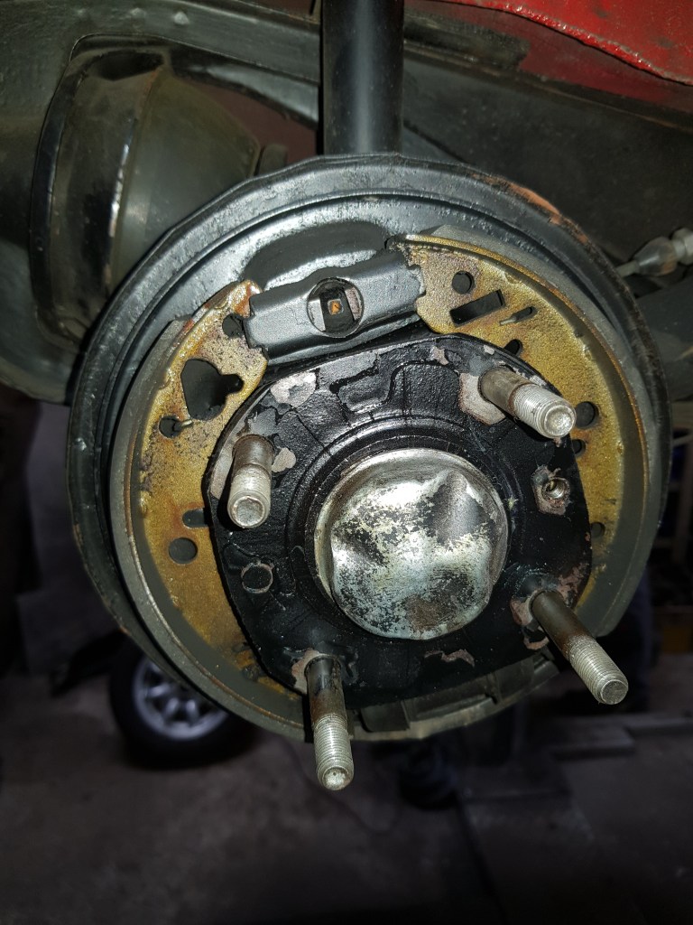 I also worked on this: Mini rear brakes. Just after a year and 6000km the new cylinder was leaking. But there is also another mistake here… this is the left side. Do you spot the error?