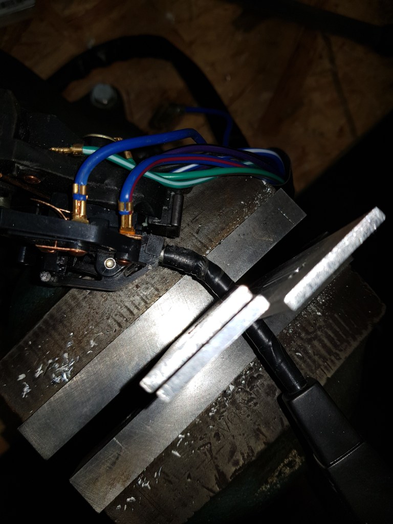 In the meantime, I decided to tackle the dashboard and indicator/wiper stalk topic. My car – C6622 – got one of the early Matthias Kauffelt walnut dashboards and I wasn’t sure if the stalks are still in an original from. But after a post on the TalkMorgan forum and after receiving some picture from fellow 4/4 drivers it seems to me that the Lucas stalks used on the Morgan 4/4 back in the 80th seem all to have been bend at the factory in remarkable angles. No matter what you do – start my wrapping the stalk on PVC tape or something – to minimize the damage on the plastic. I tried various methods to replicate the bend – the one that works was suggested by MikeCVH85. He wrote I need to drill a hole of the diameter of the stalk-tube in a piece for flatbar, put this in a vice and that bend around it.