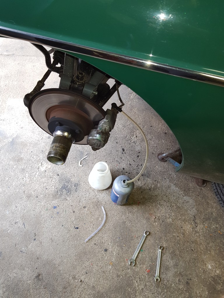 The brake pads on the left are very unevenly worn. Originally, I did not plan to also overhaul the calipers – but I might do this now as well. The rear brakes look really good – I replaced the slave cylinders last spring and will just repaint/coat the drums.