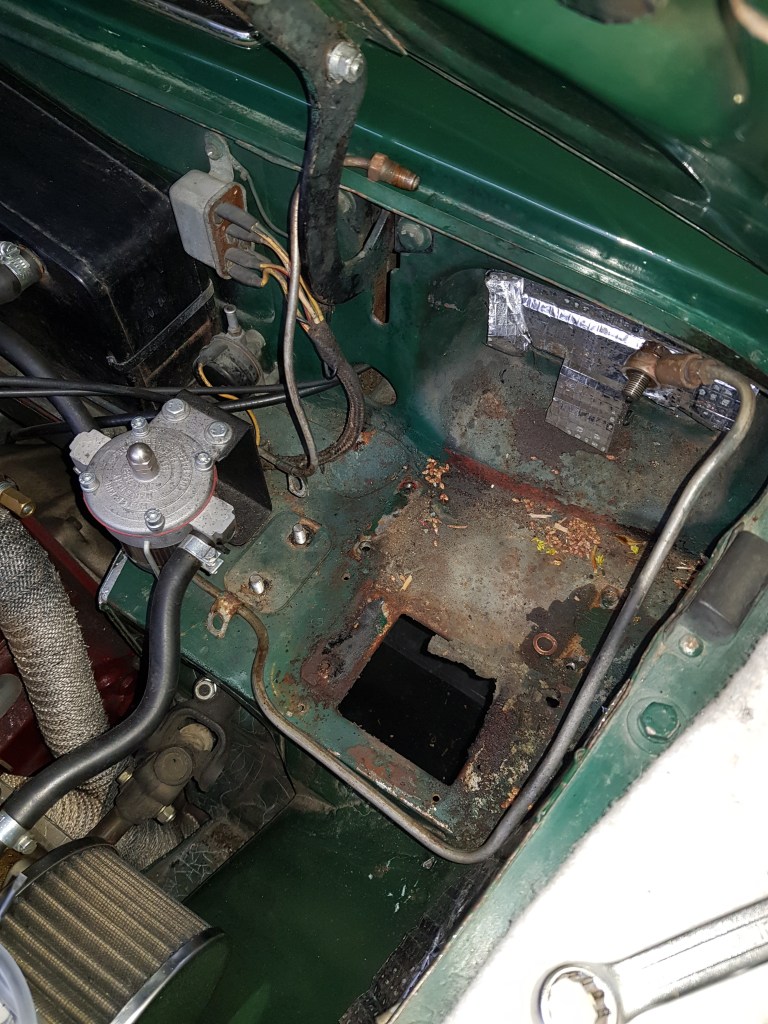 With the jacks almost fully extended it is quite nice to work in the engine bay. And there is enough space to use the crawler for some jobs I want to do under the car. The first job was to drain the brake and clutch fluid. The fluid tester showed 3 of the 5 LEDs – so the time is right to change it. Removing the pedal box was next on my list and it is an easy and self-explaining job. The seal beneath the pedal assembly was completely gone and there was a bit of dirt and surface rust. But overall, I am quite happy with the substance of the metal – it looks really solid without any major issues.