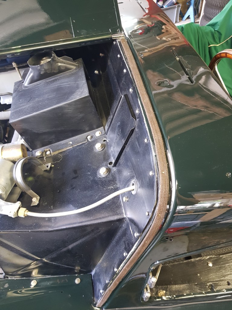 The wire wheels suffered quite a bit in the paint-shop. Overall the car is dusty and dirty. I already cleaned most of it, but especially engine bay needs a not of attention. If I do another Morgan project I would either completely wrap and cover the entire front part myself – or pay a bit more to make sure that this gets prevented somehow. For now – I have to wipe of every single part. The woven bonnet tape was next on my list. While it worked out – I highly recommend to fit it to the cowl before you install it on the car again. The ends are riveted. It worked out – but it took me a bit of time.