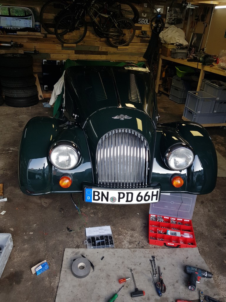 Putting the brightwork, lights and trim back on a freshly painted Morgan takes time. Well, I take my time because I don’t want to scratch anything just because I rushed myself for no reason. First task of the day was to get the car on the dolly I built last year. This has 8 large casters (10cm diameter) in total and allows better movement on the old garage floor. It has a height of 35cm and the chassis sits on it- so the car is raised approx 23cm which is OK – occasionally I envy people that that a proper car lift in their garage.