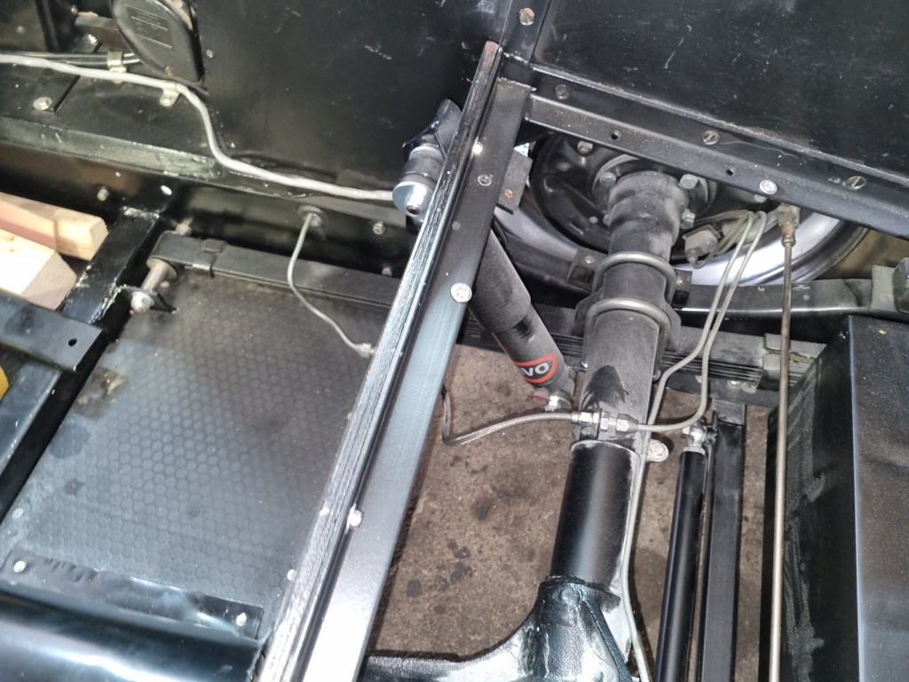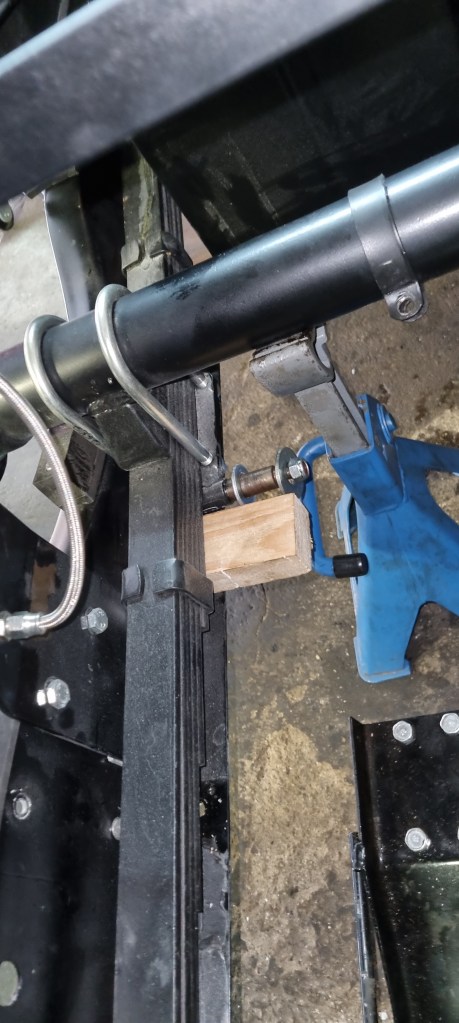 I repositioned the axle stands – away from the chassis under the rear axle. my weight in the chassis was enough to get a piece of wood under the leaf spring…. yes I need to go on a diet…