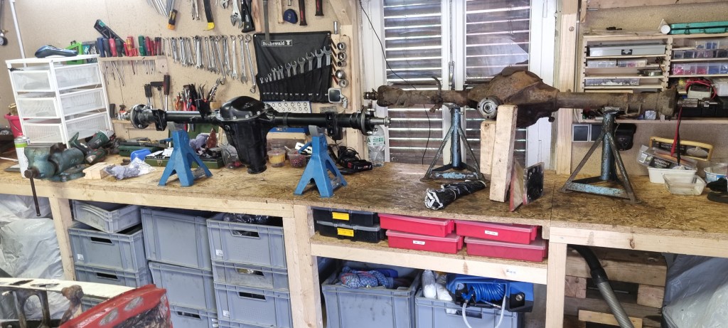 Two axles on the workbench. To the left: Salisbury 7HA for the Morgan 4/4. To the right. Salisbury tube style axle from an MGB