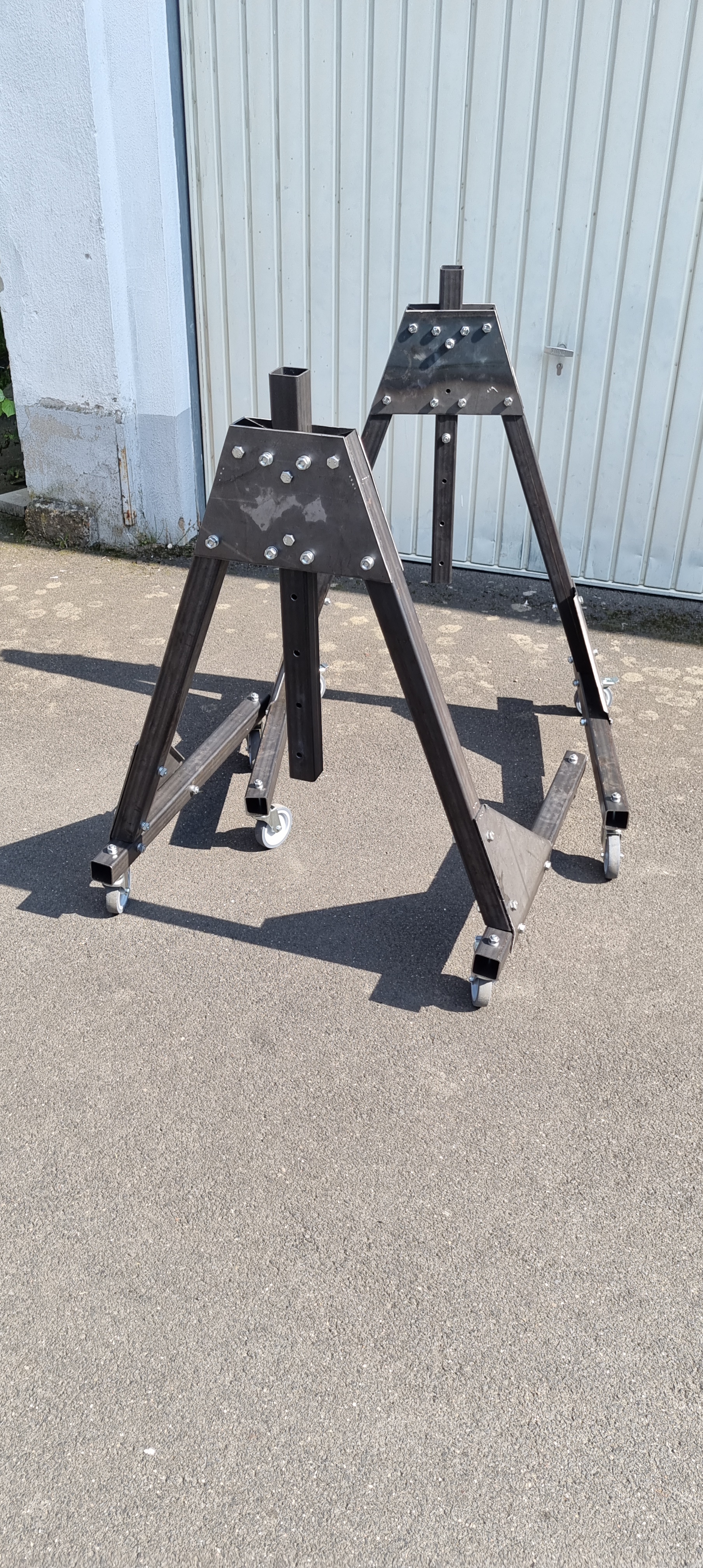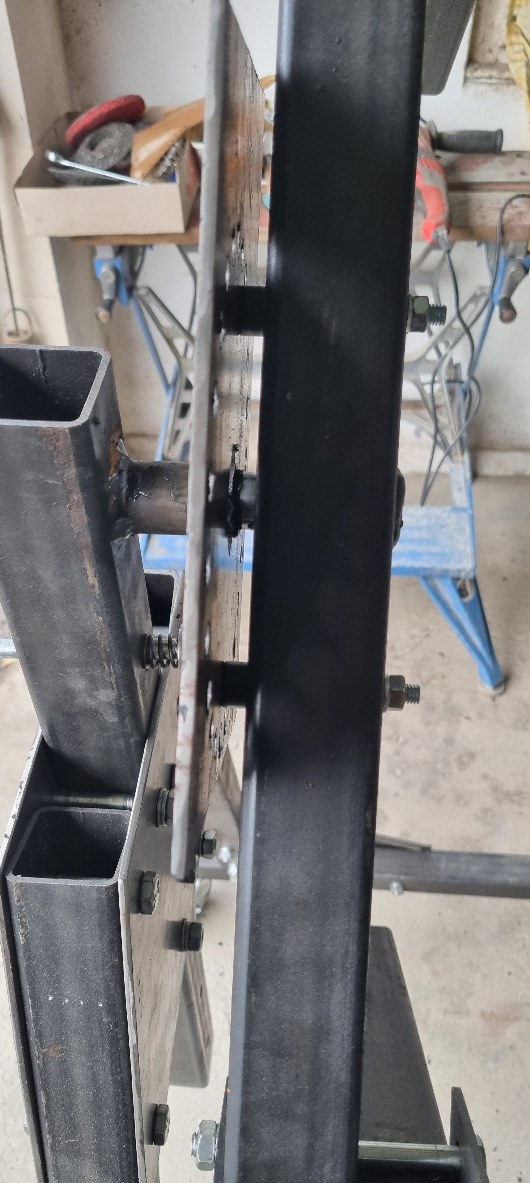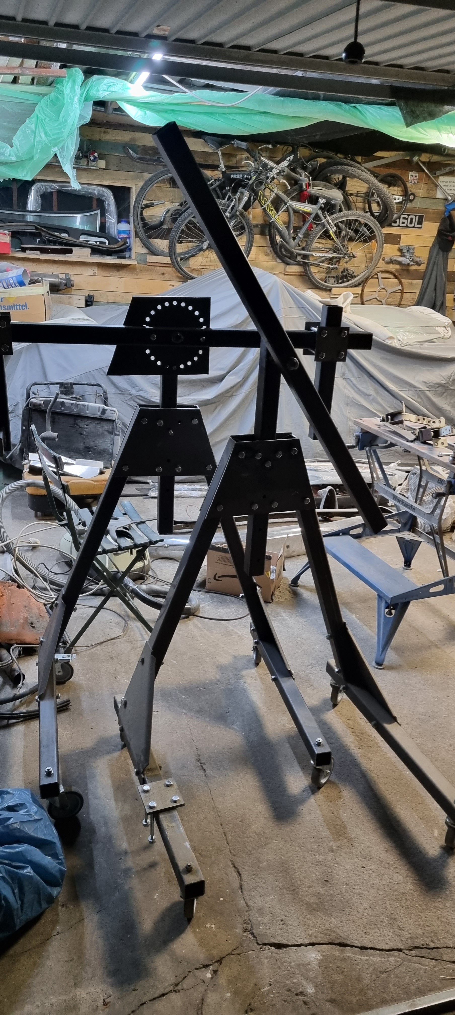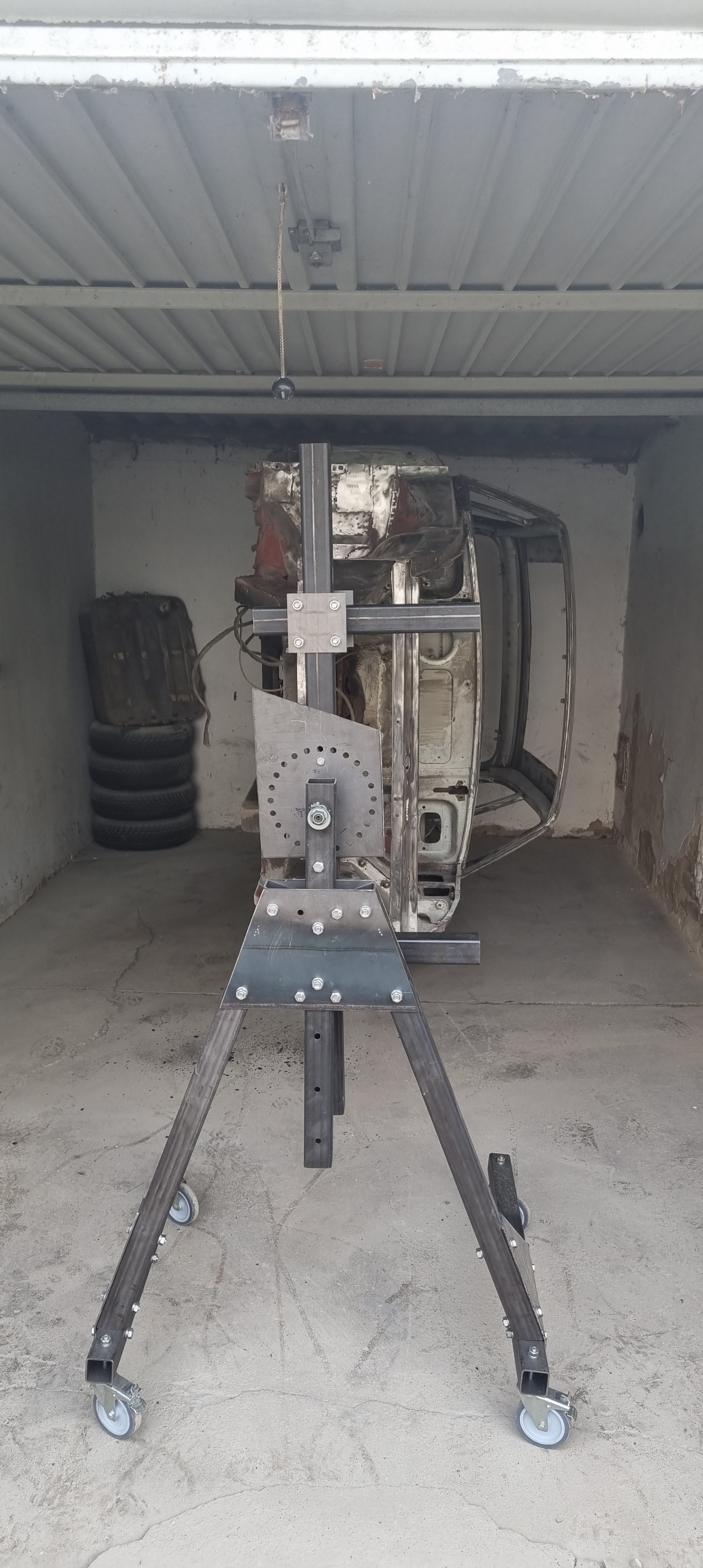 All-in-all I spent 291€ on material and 50€ for external help. To be precise: 128€ on 12meter of 50x50x3mm square steel tubing, 30€ on heavy duty castors from Amazon, 37€ on bolts, washers, nuts and a spring, 50€ on 3mm black sheet metal (100cm x 65cm), 26€ on pre-drilled 100x100x4mm anchor plates (Ebay) and 10€ a small piece of 28mm steel tube. Additionally, I also bought a few new metal drills, and I was fortunate to have access to a workshop with professional tools. I gave up counting the hours that went into the jig – and I haven’t even painted it yet. Two old shock absorbers from the trash pile at the body & paint shop act as pivot points and were welded into the crossbars while I was sick this week.