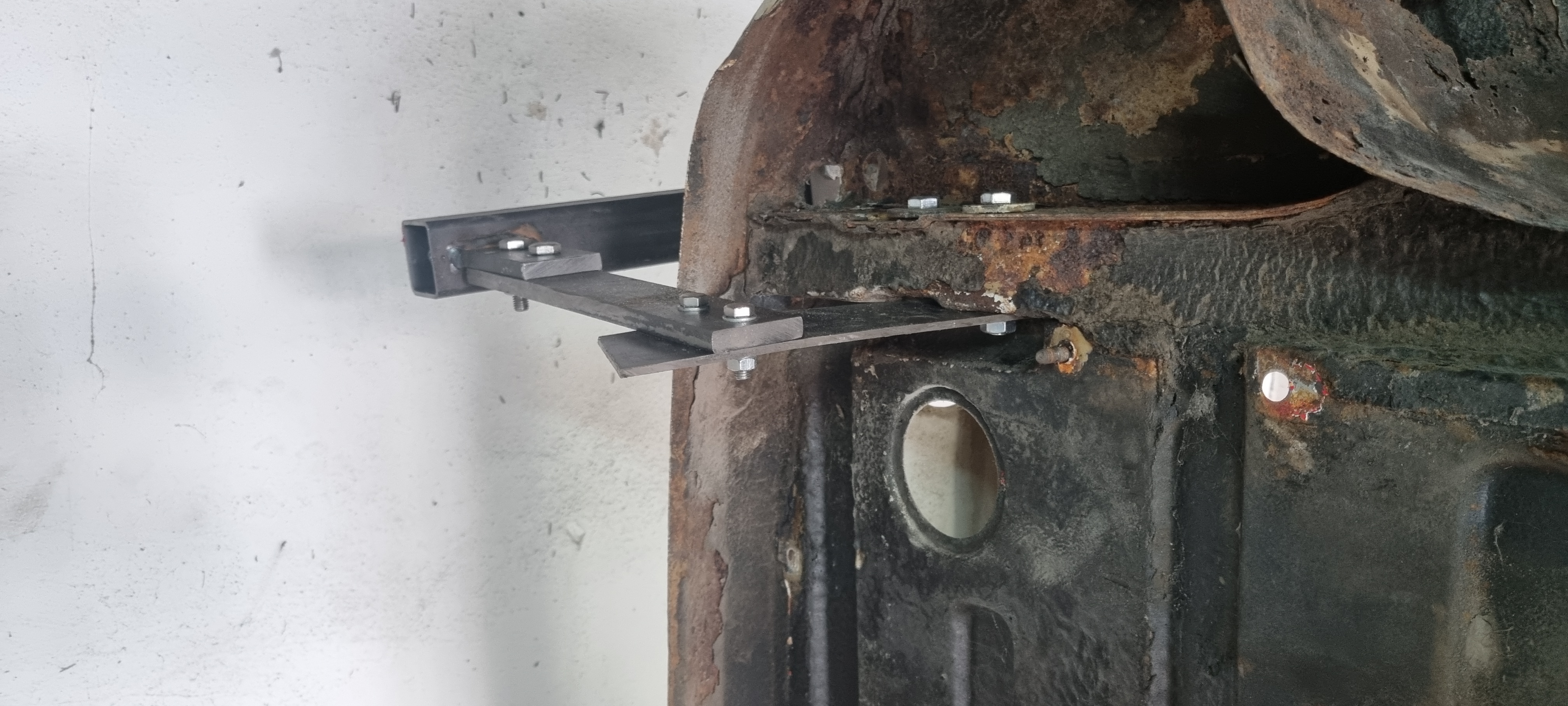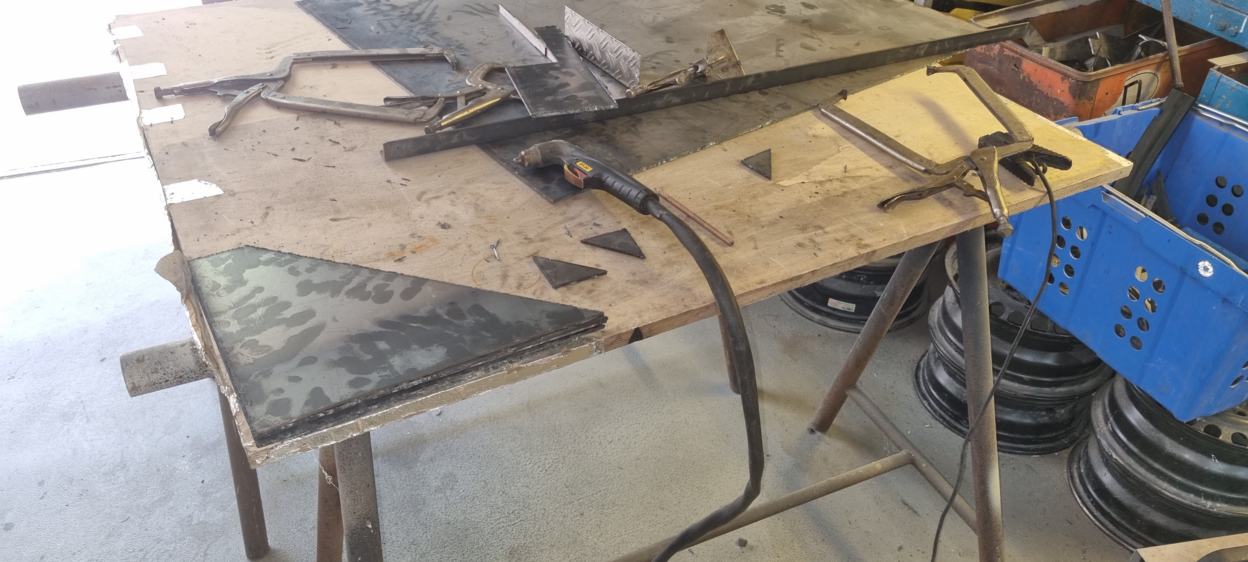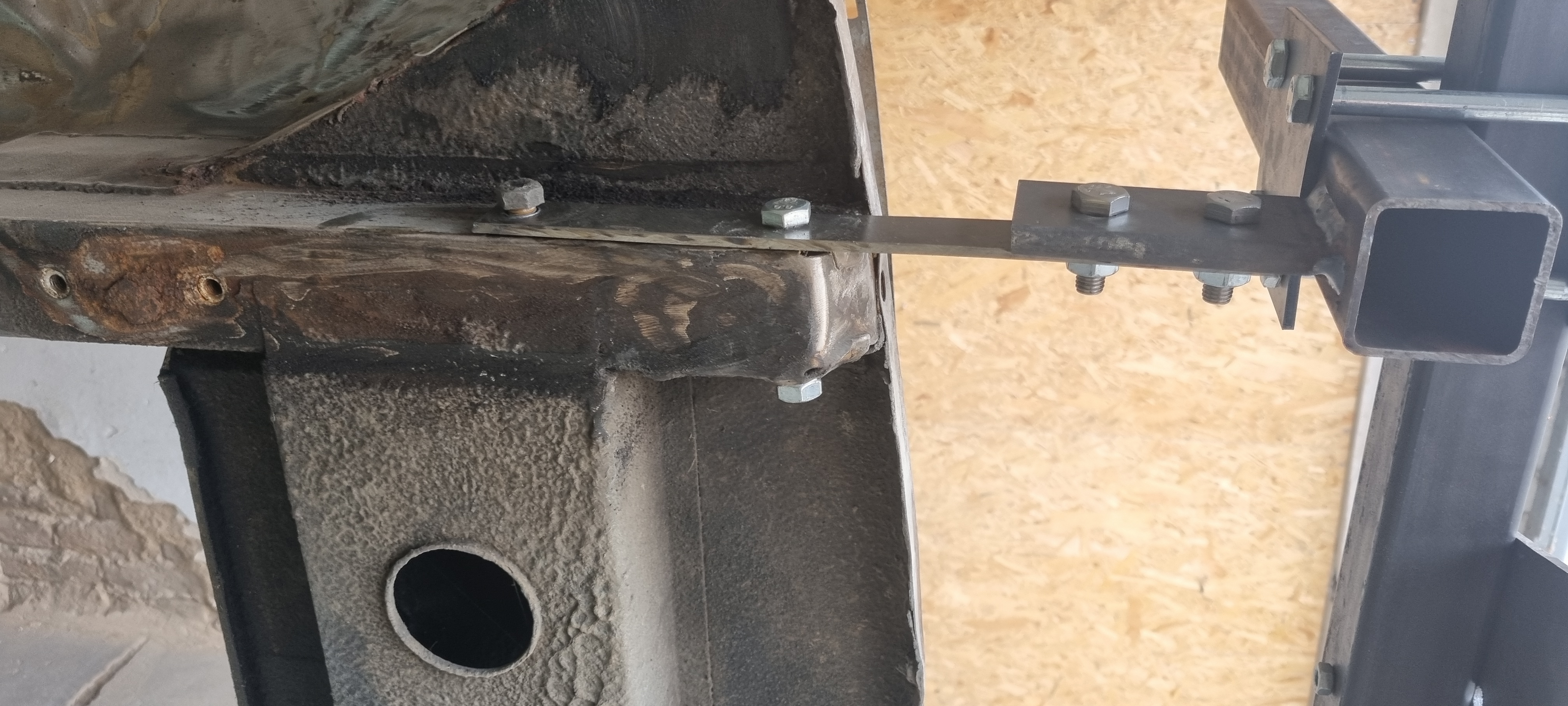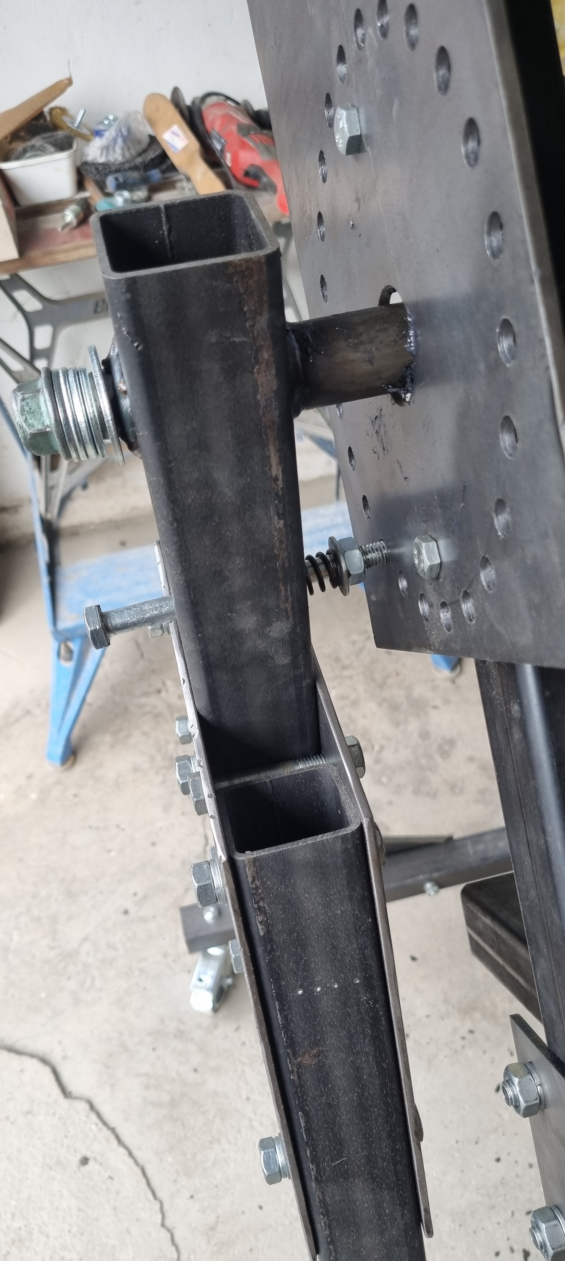 All-in-all I spent 291€ on material and 50€ for external help. To be precise: 128€ on 12meter of 50x50x3mm square steel tubing, 30€ on heavy duty castors from Amazon, 37€ on bolts, washers, nuts and a spring, 50€ on 3mm black sheet metal (100cm x 65cm), 26€ on pre-drilled 100x100x4mm anchor plates (Ebay) and 10€ a small piece of 28mm steel tube. Additionally, I also bought a few new metal drills, and I was fortunate to have access to a workshop with professional tools. I gave up counting the hours that went into the jig – and I haven’t even painted it yet. Two old shock absorbers from the trash pile at the body & paint shop act as pivot points and were welded into the crossbars while I was sick this week.