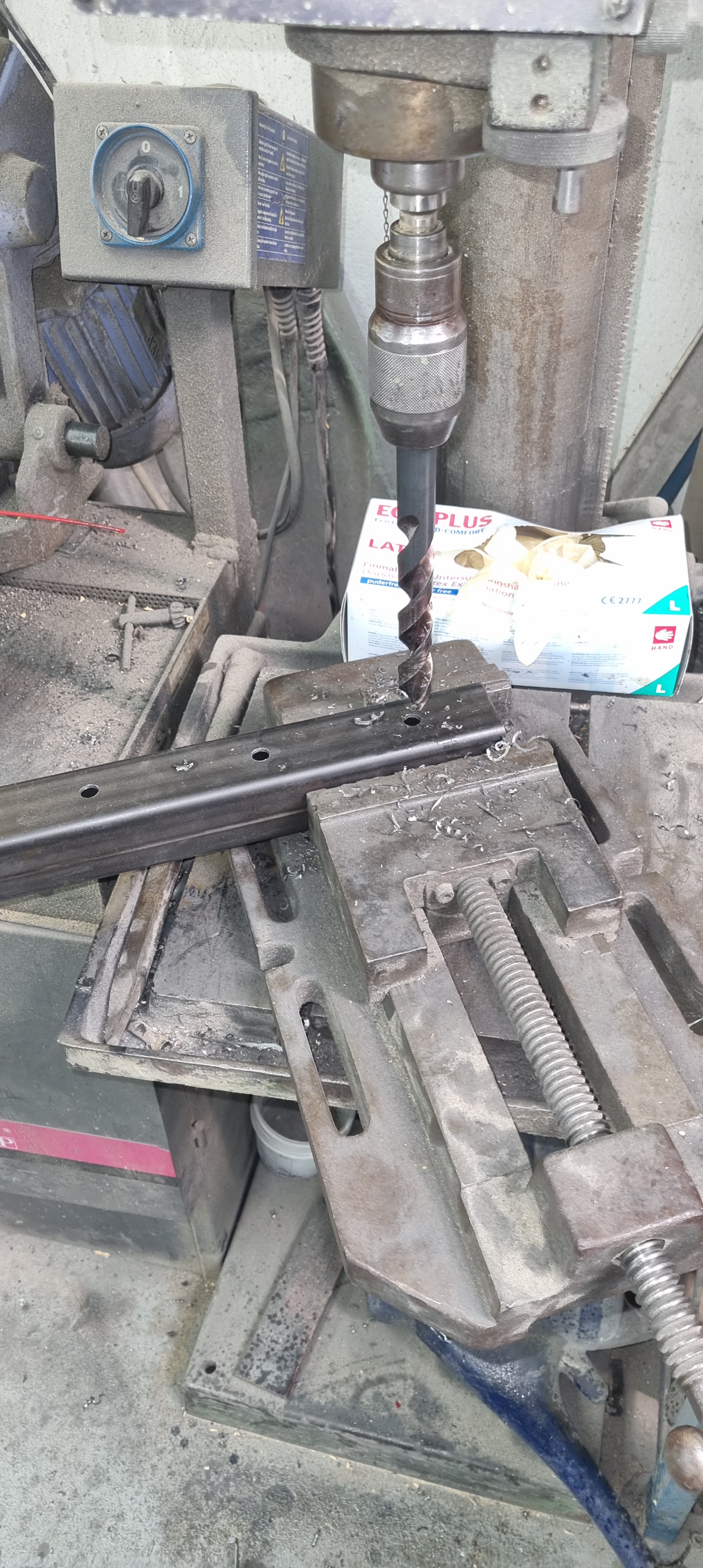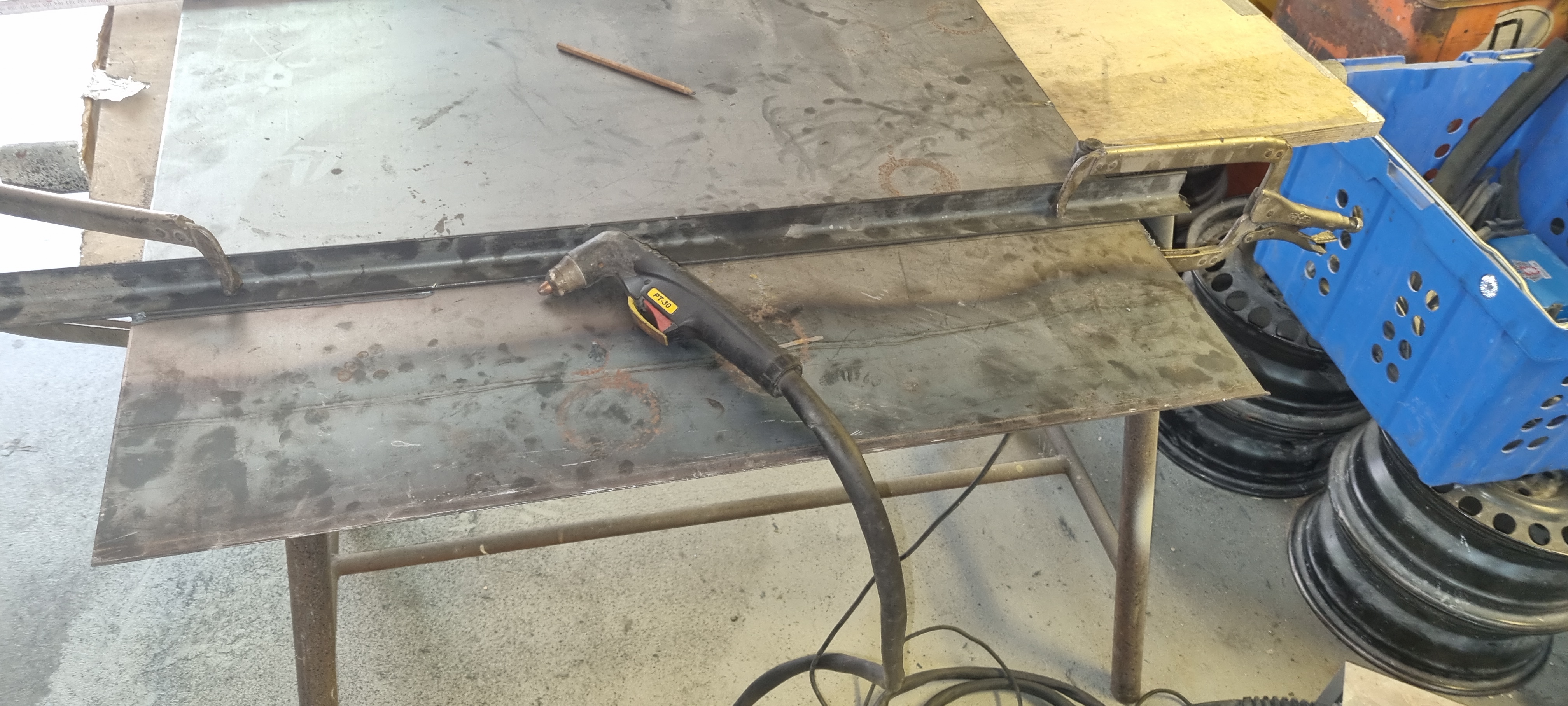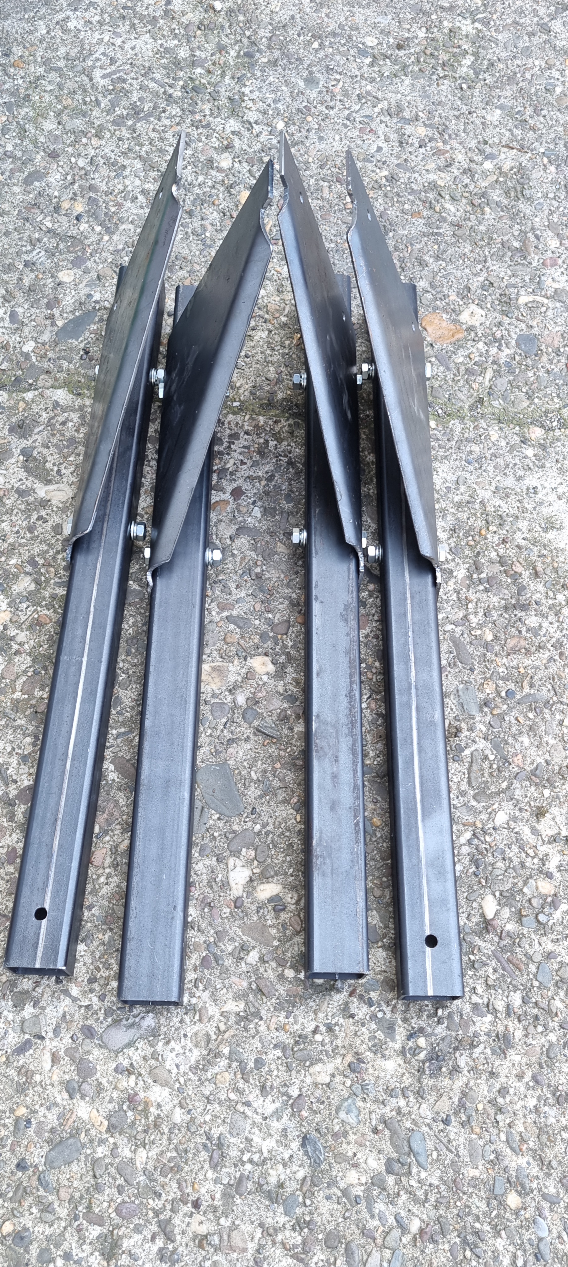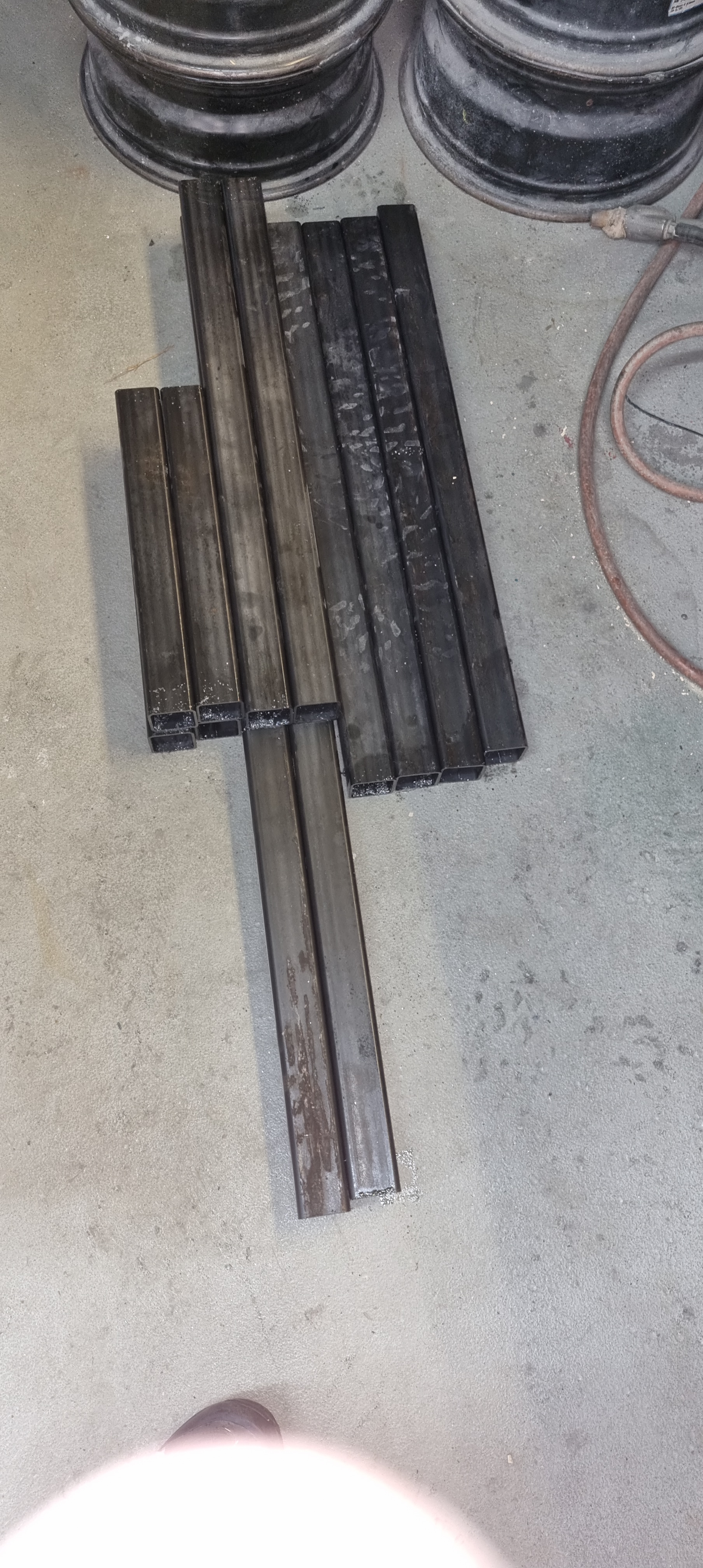 All-in-all I spent 291€ on material and 50€ for external help. To be precise: 128€ on 12meter of 50x50x3mm square steel tubing, 30€ on heavy duty castors from Amazon, 37€ on bolts, washers, nuts and a spring, 50€ on 3mm black sheet metal (100cm x 65cm), 26€ on pre-drilled 100x100x4mm anchor plates (Ebay) and 10€ a small piece of 28mm steel tube. Additionally, I also bought a few new metal drills, and I was fortunate to have access to a workshop with professional tools. I gave up counting the hours that went into the jig – and I haven’t even painted it yet. Two old shock absorbers from the trash pile at the body & paint shop act as pivot points and were welded into the crossbars while I was sick this week.
