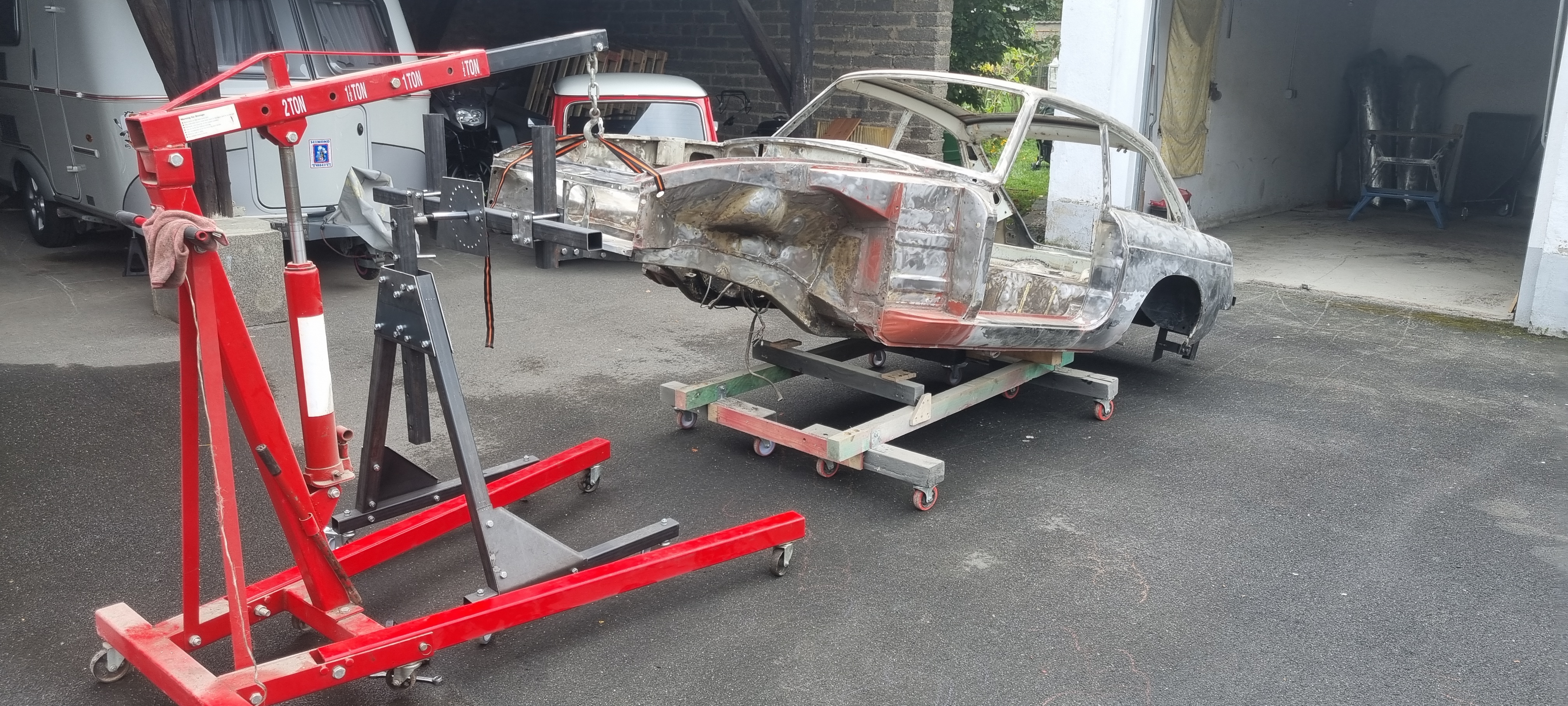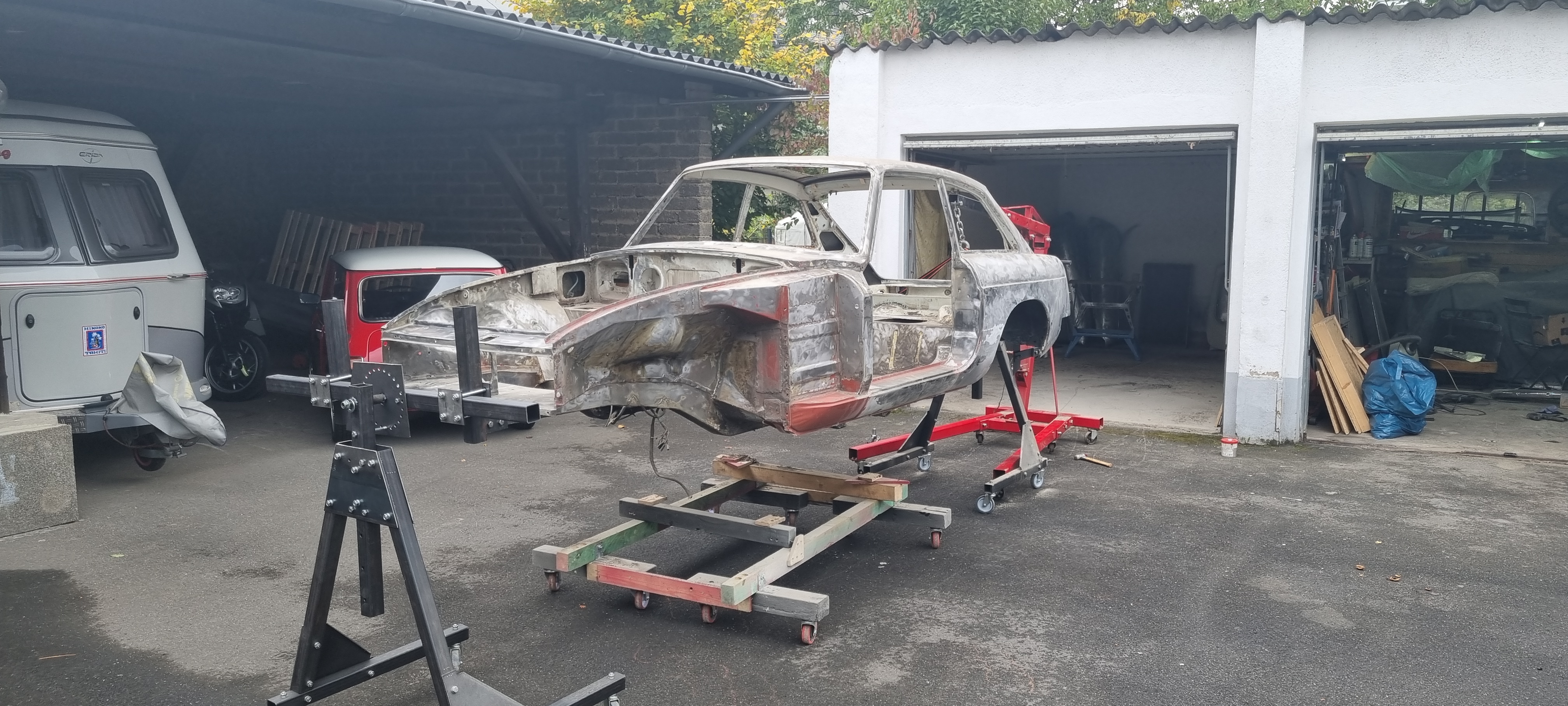 Mildred is up-in-the-air. It took a while to finish my roll-over jig, but it’s finally done now. A rotisserie – or roll-over jig – is most helpful if you do a full body restore. Sure, there are other ways to clean the underside and do some welding – but this is 1000 times more convenient. And while I am excited about the fact that it works out the way I hoped – I would advise against the DIY route I have taken.