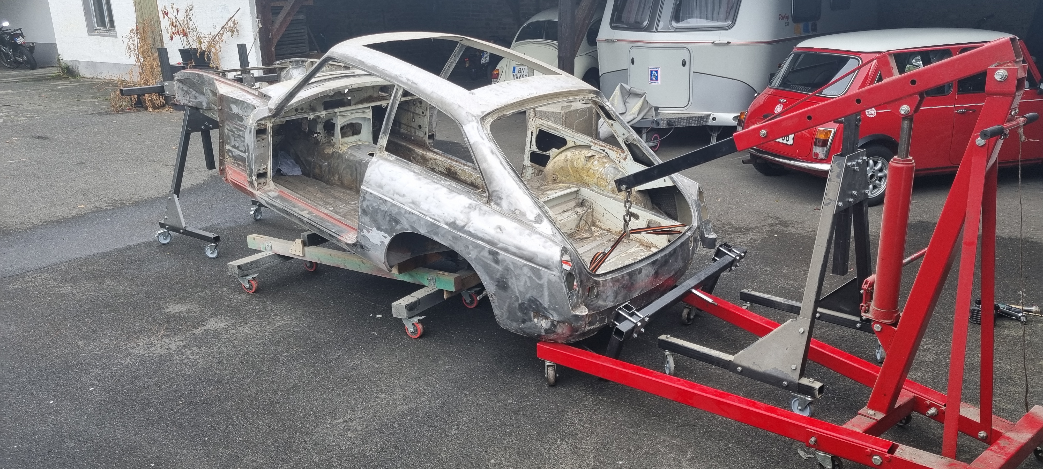 Today I finally had the chance to put everything together and mount the MGB shell to it. As you can see, I drilled a oversizes hole on the mounting pieces. This allows the crossbar some degrees of flexibility which is important while fitting the car to the jig. I started by attaching both front and rear crossbars with some adapters (made from some scrap metal I had – room for improvement here…) to the front and rear bumper mounting points. Then I used my engine hoist to lift the front until the pivot point lines up with the base. Then I moved the hoist to the back and did the same there. Tightened all mounting bolts – job done.