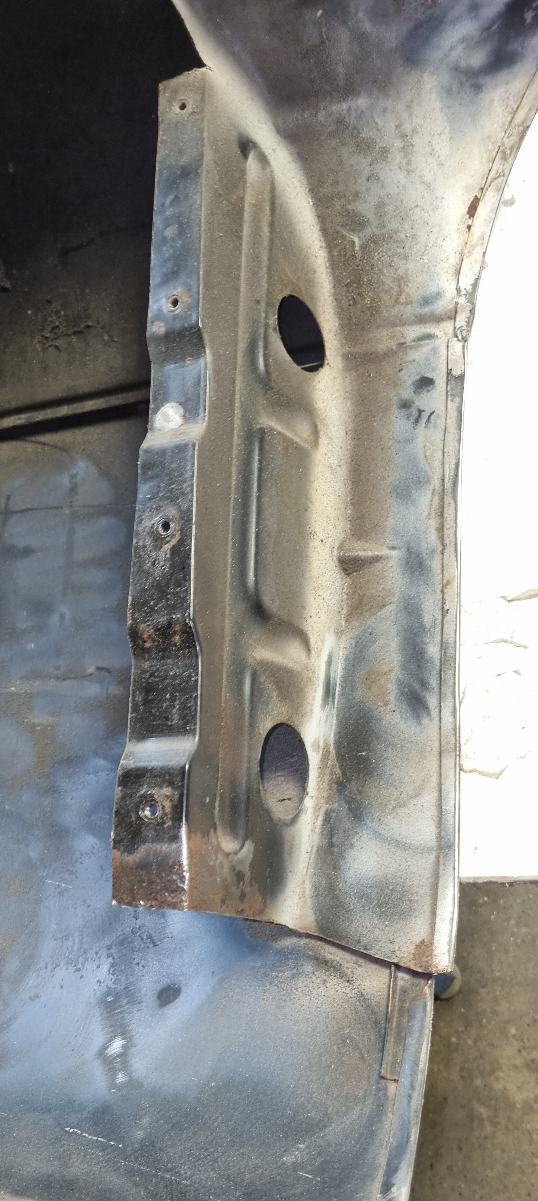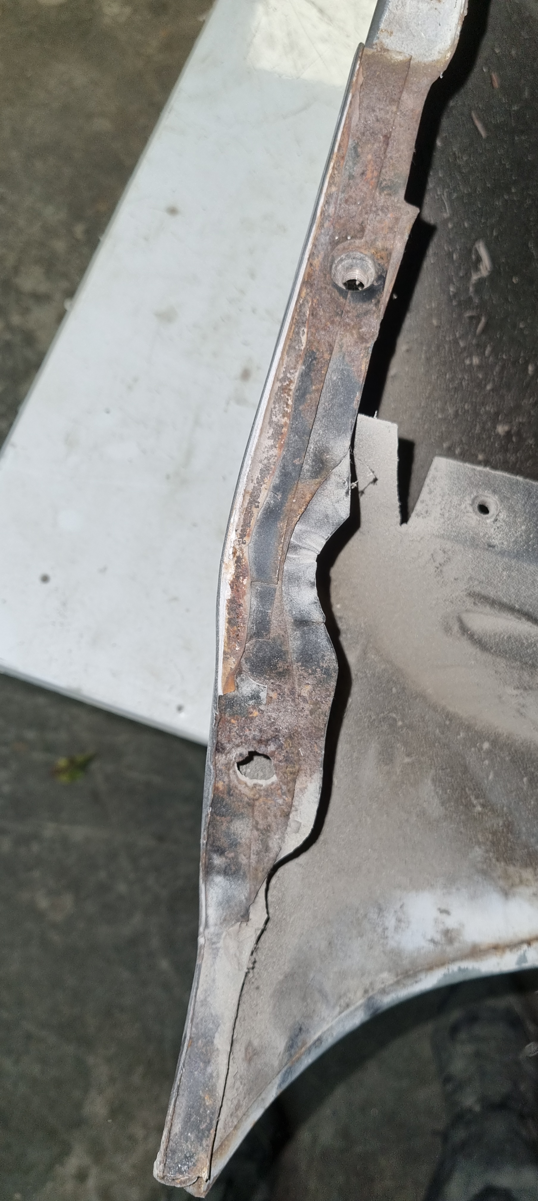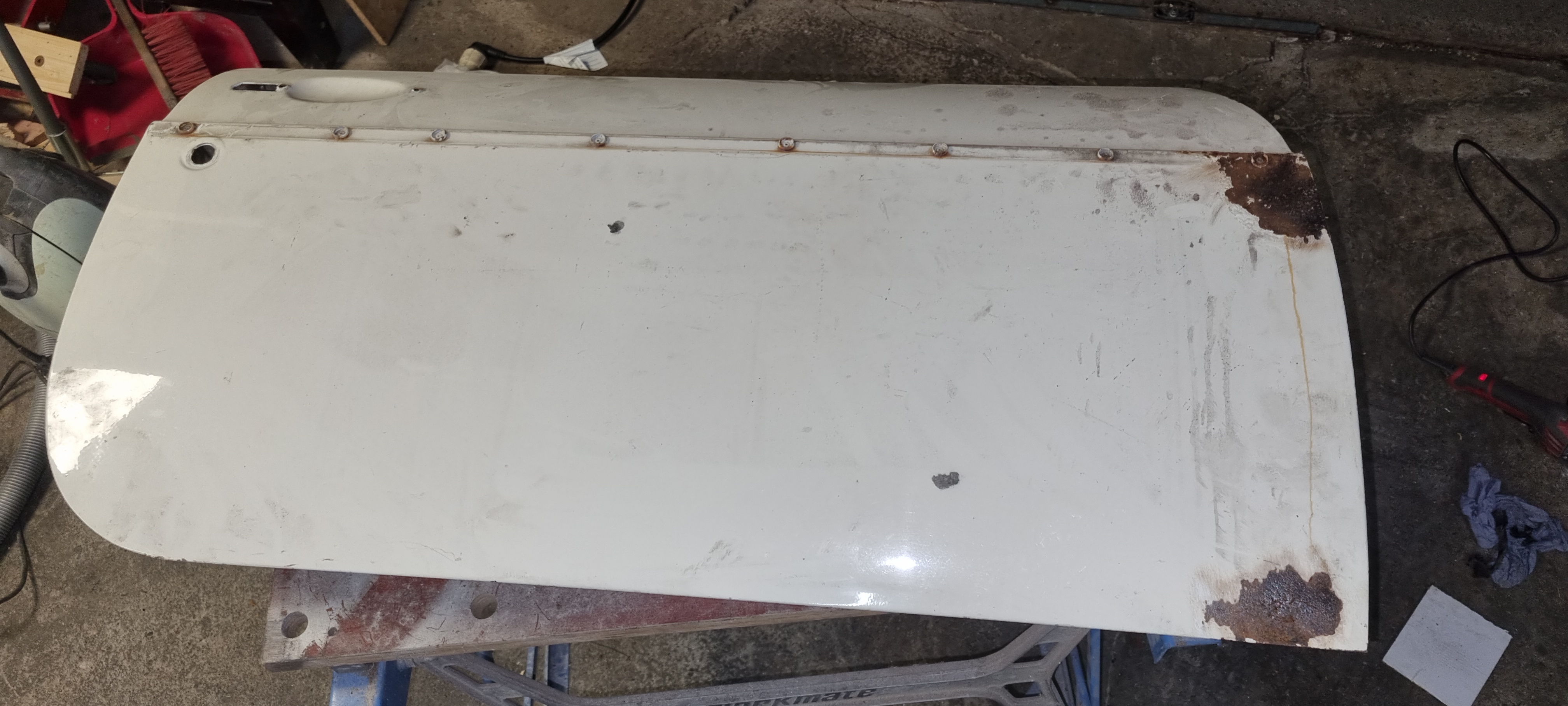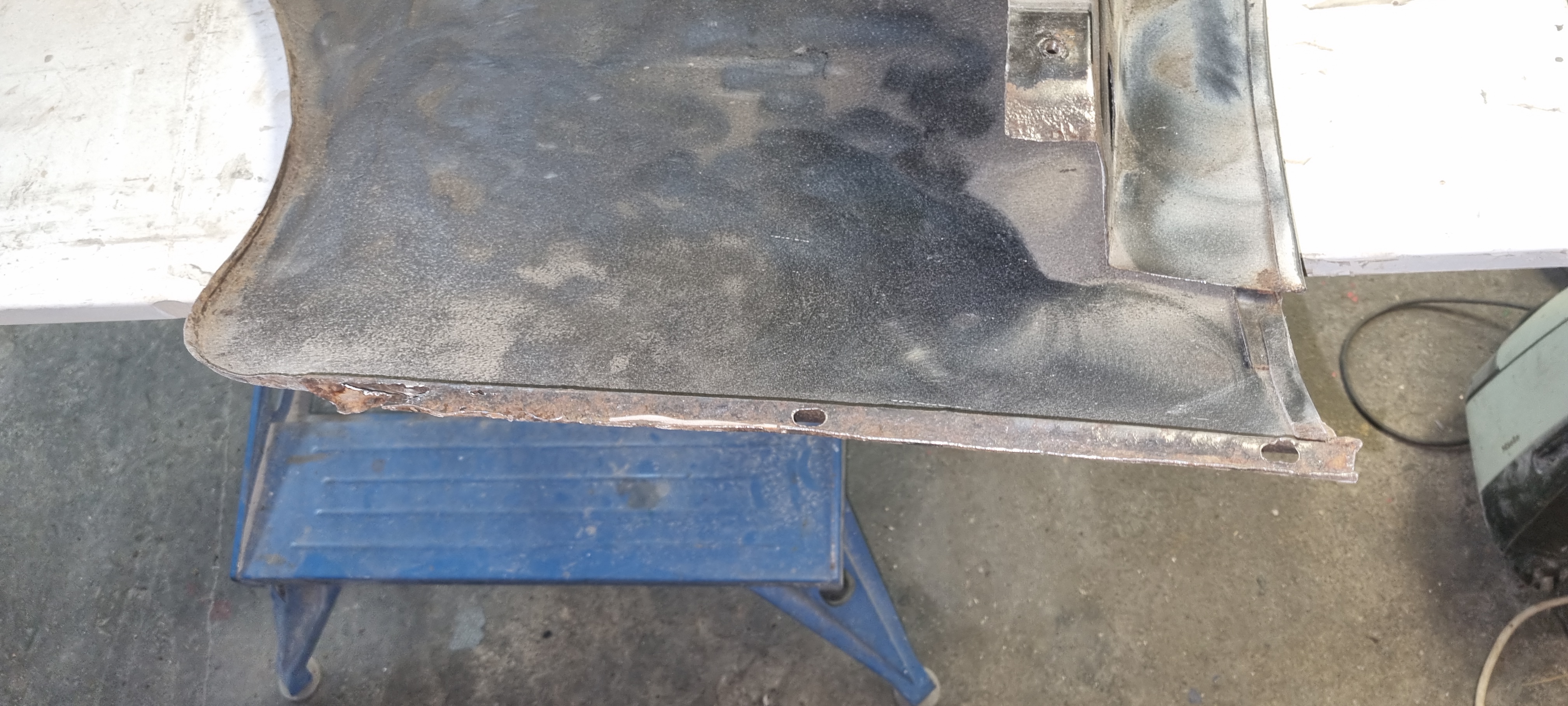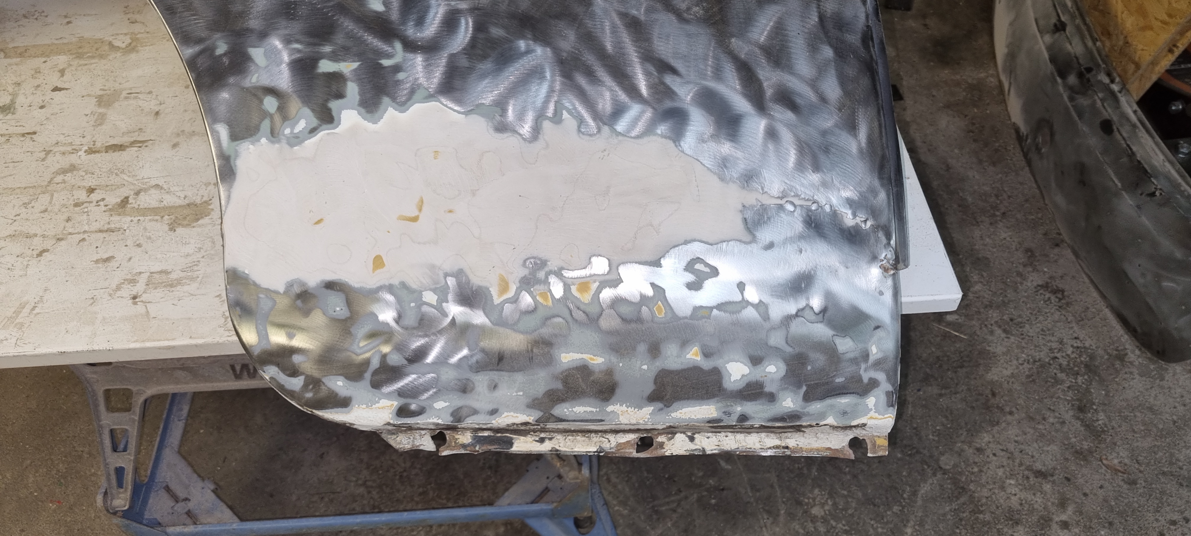 Same applies to the front wings. The right wings look in quite good condition. It just needs a simple small repair on the lower rear edge The left wing has been welded before. I will get a rear lower repair panel for this. Maybe for both sides. (costs ~75GBP per side). The replacement is straight-forward and I can do the prep-work. The doors need new skins – and I already got new skins with the car. It was too late to use the flappy disc on the grinder around the edges tonight. Plan is to strip the entire inner door part and prime it before the new skins come on. Sandblasting might be too harsh for this – I think I am going to contact RTEC for this again…