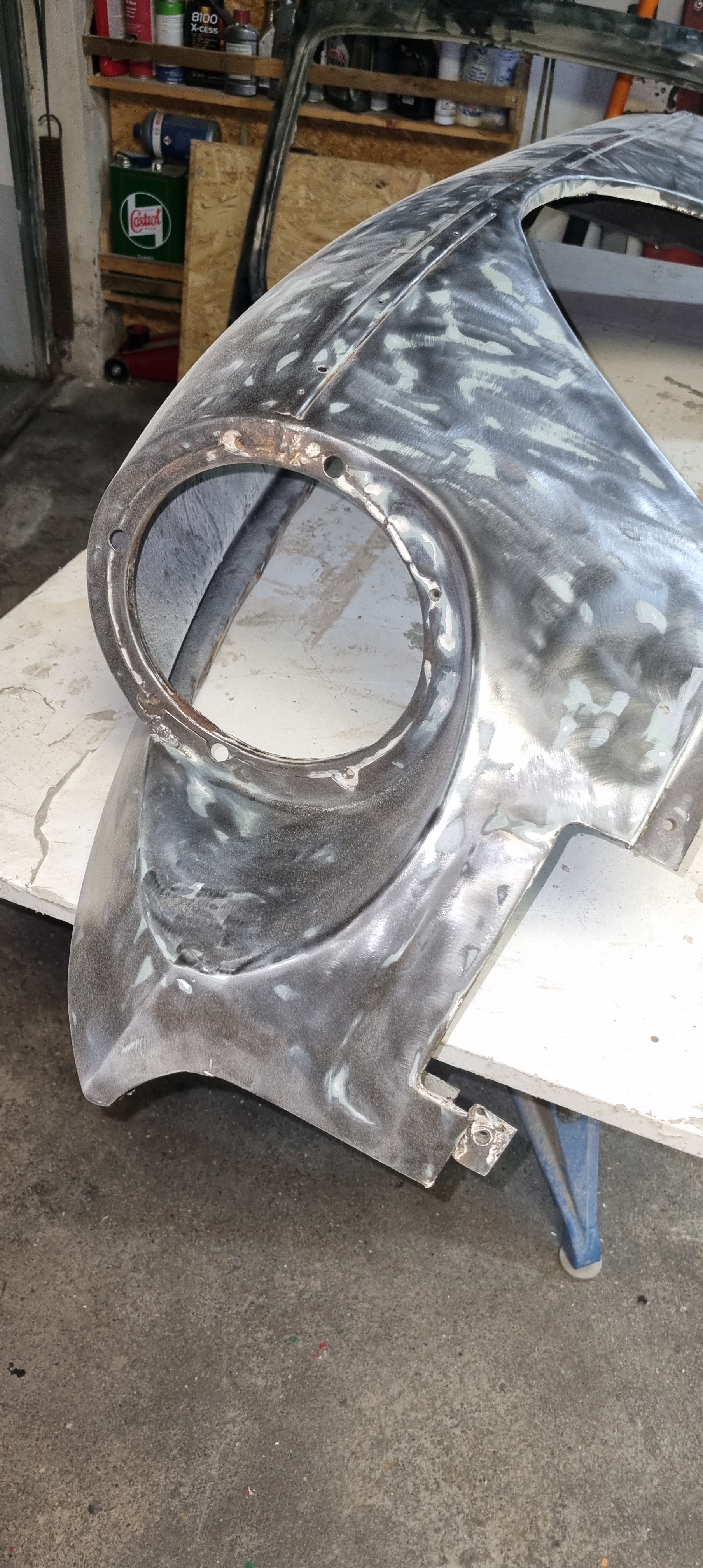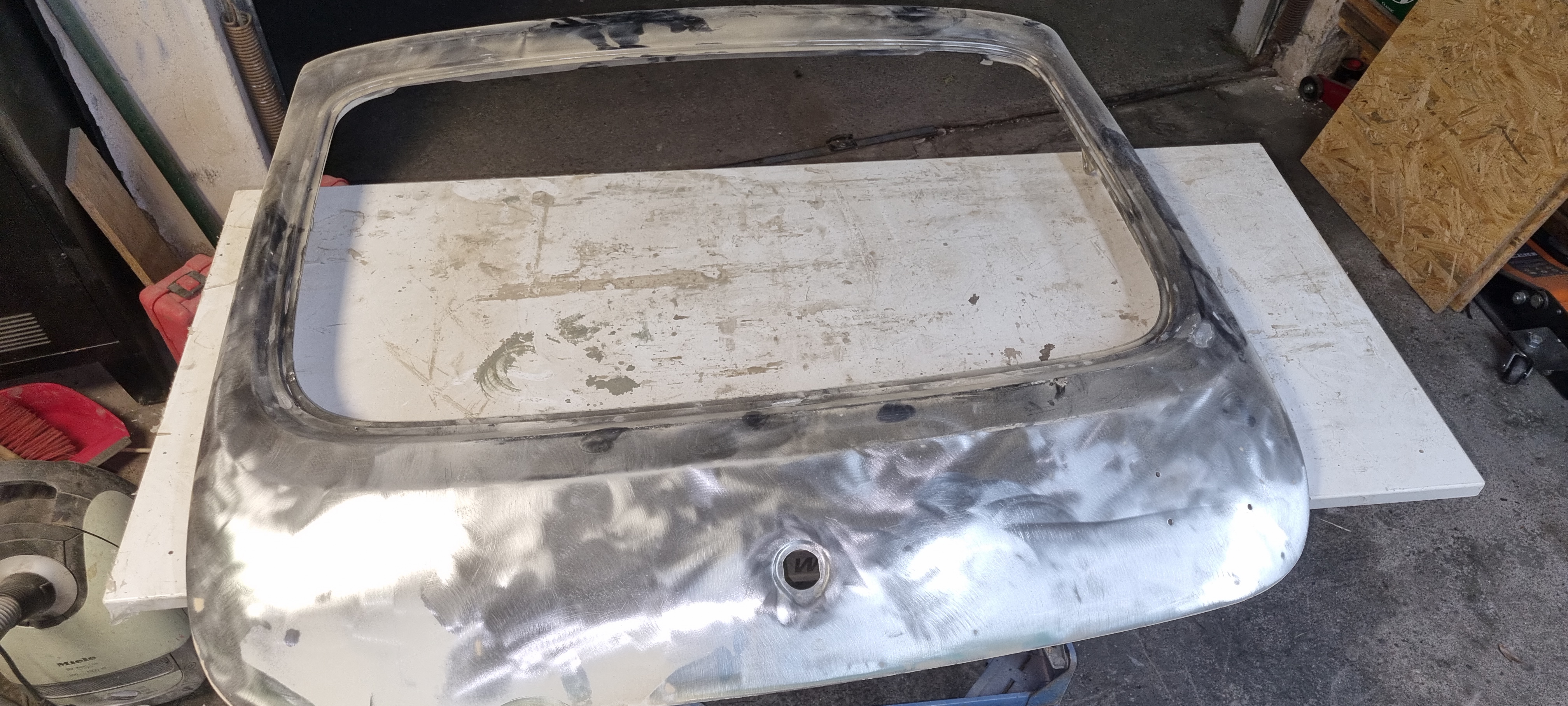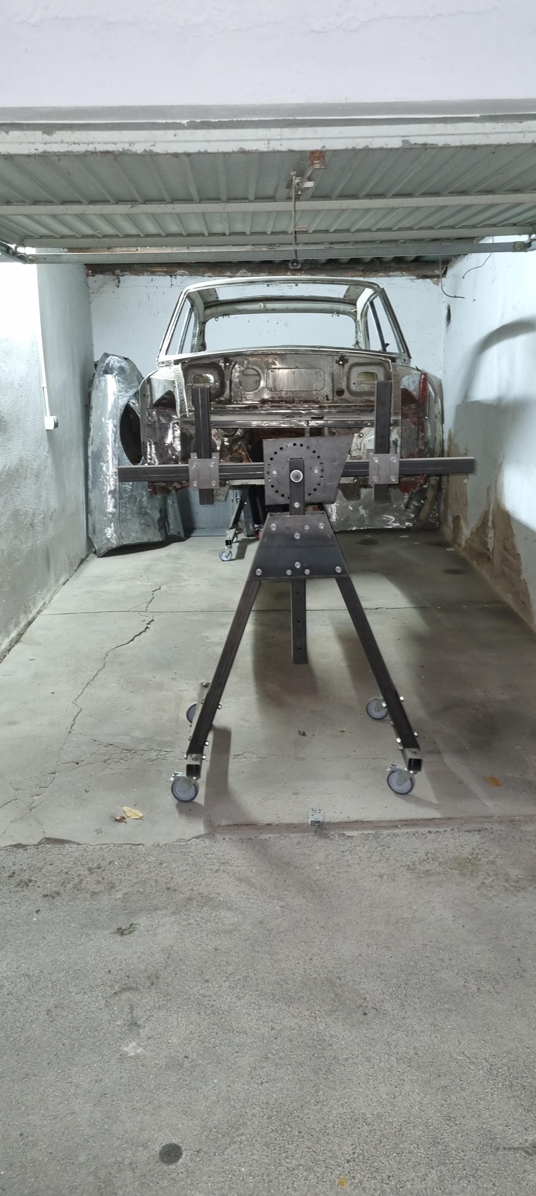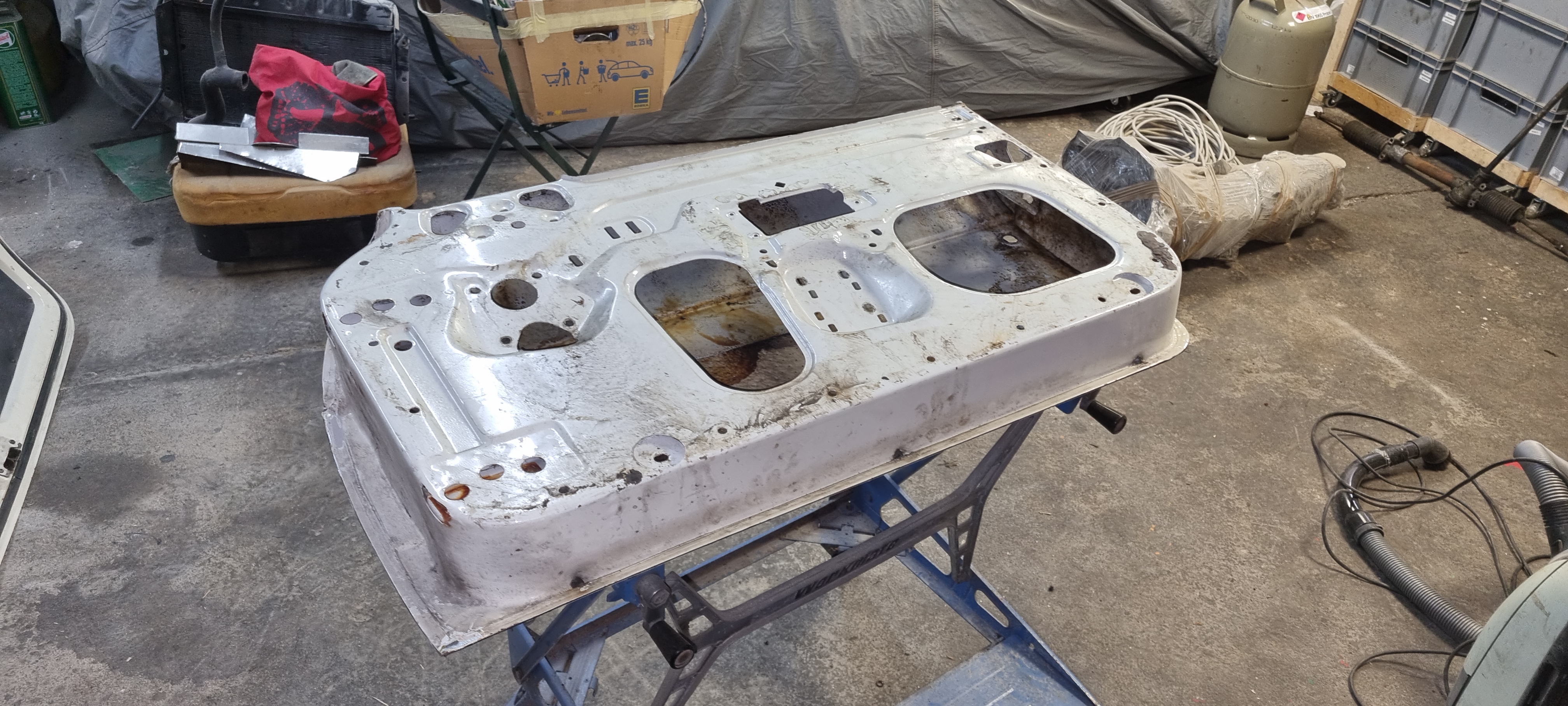 So: time to carry on with different tasks. Cleaning up both garages was top on my list. On Monday evening I pulled everything out in the yard and tried to get as much dust and dirty out as possible. Stripping a shell is a messy business. I completely understand why most people prefer to have the shell blasted (whether it is dry ice, sand or other media). But swinging the broom is a great workout 🙂