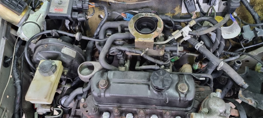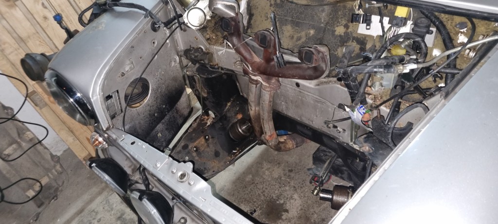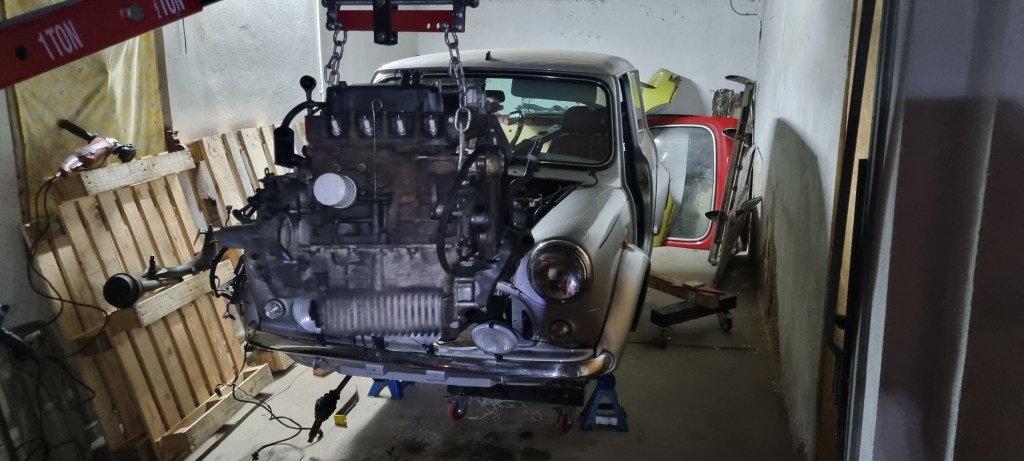 Talking of the Mini 40 – tonight I removed the engine form the Mini to lower the front subframe. While I like to think that I did not waste any time – it still took me 2,5 hours to disconnect and remove all remaining auxiliaries – mainly the brake servo, exhaust, inlet manifold – and lift out the engine. Doing this in the dark after 5pm with 4°C outside is not as enjoyable as it could – but the main garage is completely stuffed with MGB parts right now.