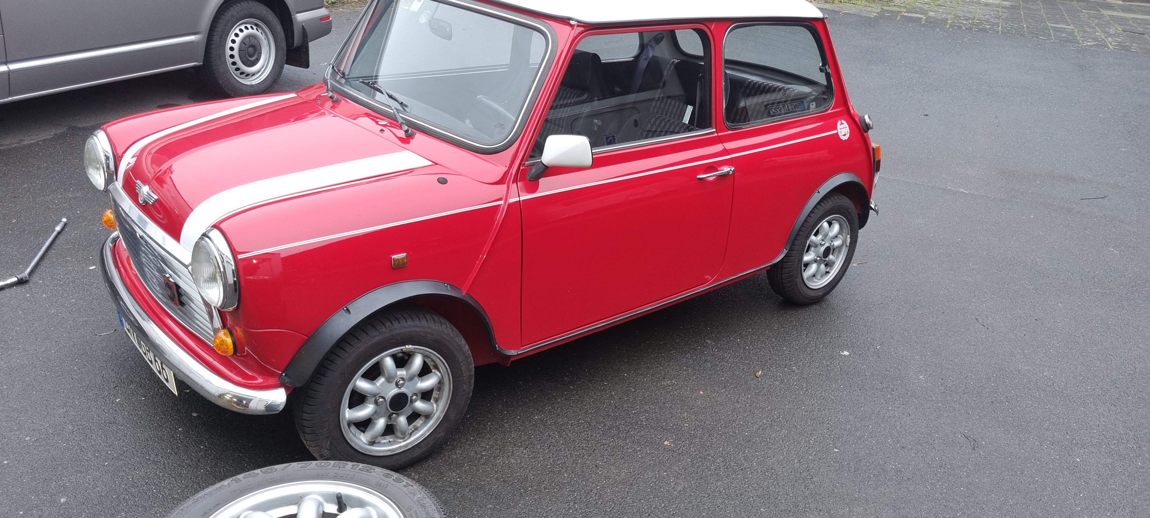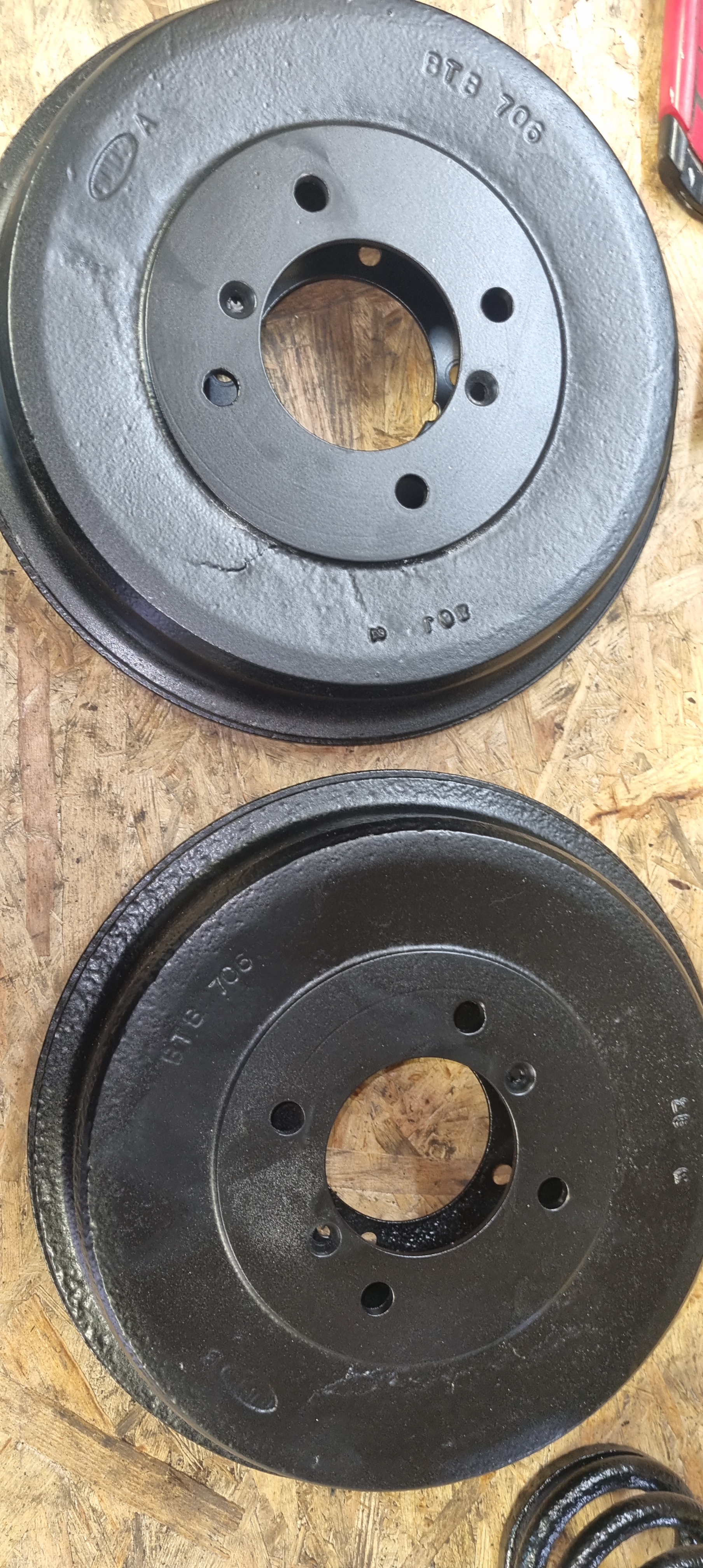 While the tumbler was doing its job, I quickly changed tires on Miffi. Initially I did not want to drive Miffi too much in the winter, but as there might be an upcoming car change in the family – she will be my daily driver again. And as I have a set of “Polarbear” winter tires, I might as well use them. With the Mini parts I also picked up the first batch of MGB parts from powder-coating. The rear brakes, the pedalbox, the gearbox crossmember and some brackets turned out OK. Some areas were rusted and pitted quite a bit. The surface therefore isn’t perfect.