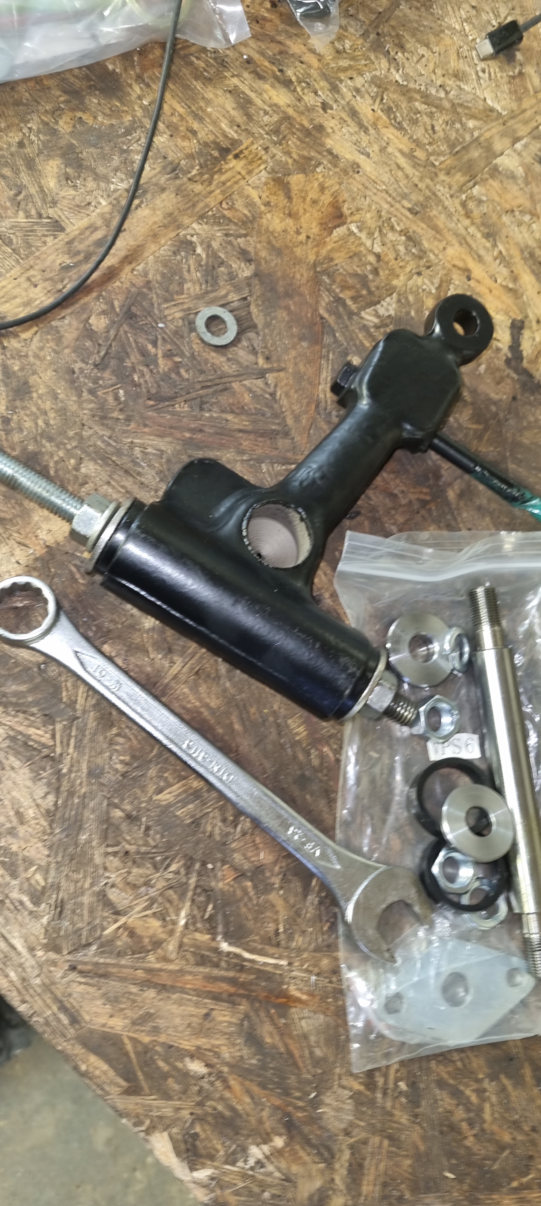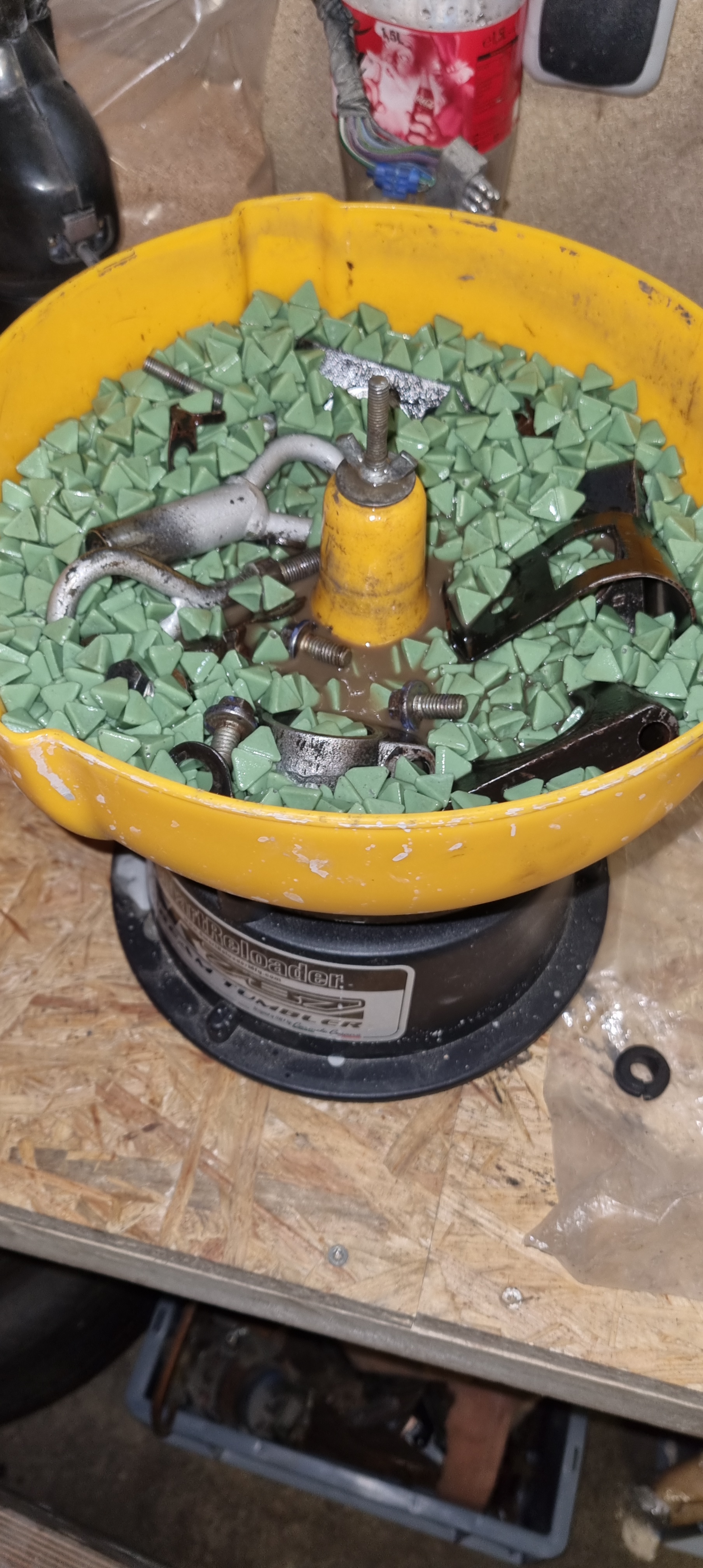 The needle bearings on the front upper arms went in easily. I used a piece of threaded rod and some nuts to pull them in. New wheel bearings for the Mini should hopefully also arrive this week. The new tumbler which I bought to “polish” the SU carburetor parts, also turns out to be great for cleaning the dirty screws from the Mini engine.