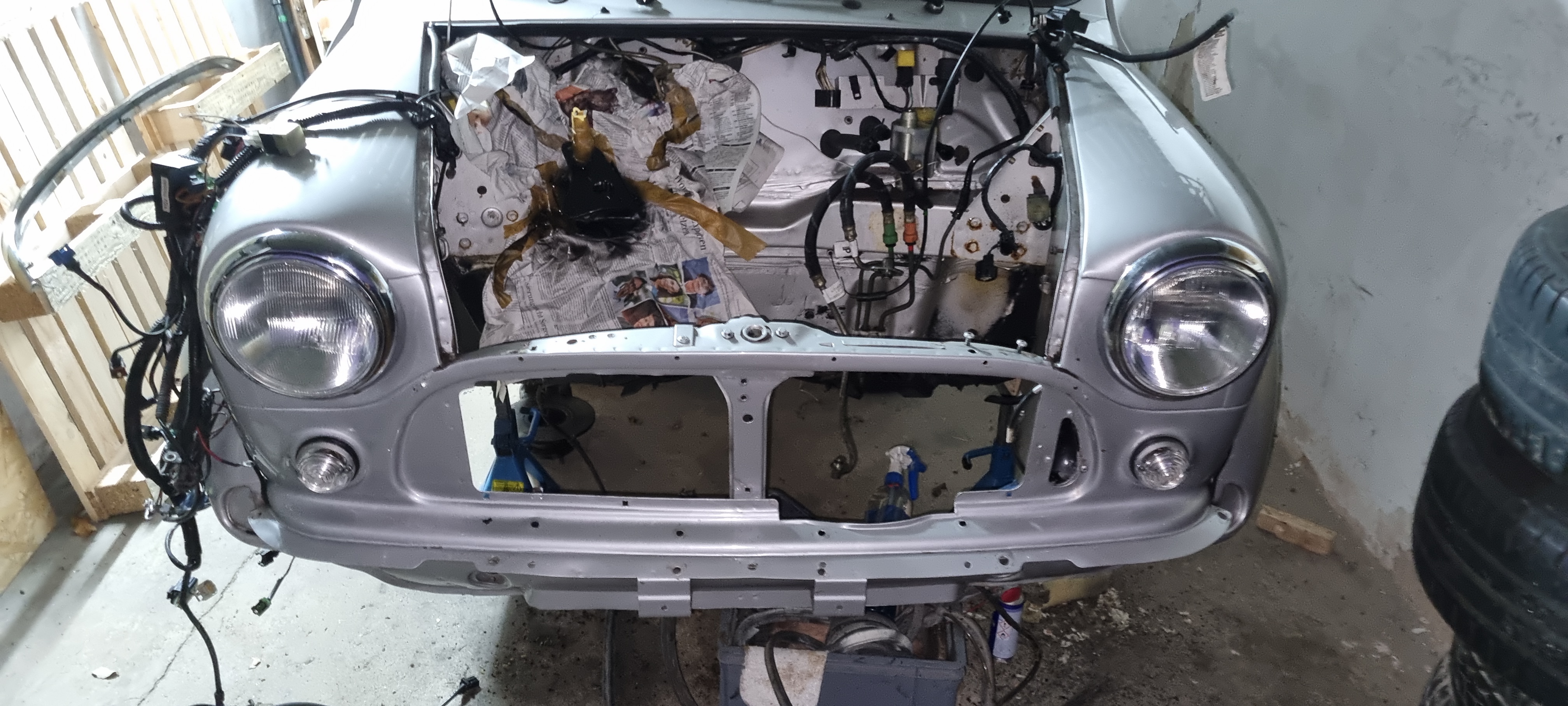 Today I cleaned up the engine bay. It will get a bit of paint in some areas and the new steering rack and freshly painted front subframe hopefully should be installed next week. I also removed the dashboard as the piece around the gauges needs attention. The Mini 40 edition has an “alloy”/silver dashboard. The dashboard fastings of an MPI classic Mini are different from e.g. the Mk V version I have (aka Miffi). Actually, it is a lot easier – but it took me a few minutes to figure it out. The paint shop needs to deal with this part now. One of the things I will try to find out is how to “defog” the glass of the fog lights 🙂