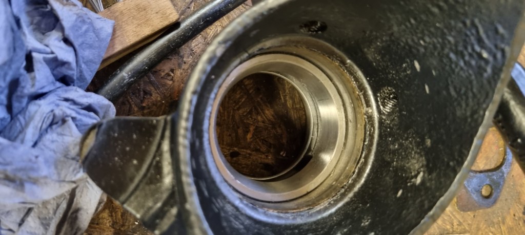 Therefore, I quickly got some parts for Kischka in cologne this week. After a night in the freezer the new races for the wheel-bearings went in easily. As the hubs were blasted and powder coated – I had to thoroughly clean the grease lines. Before installing the new ball joints, I squeezed a load of grease through the lines which still included a lot of particles. Having rebuild a few subframes now – I forgot taking pictures – in the end it is really straight forward once you have all parts sorted. And yes – I did knock over the locking ring on the ball-joint after I took the picture below of all parts 🙂