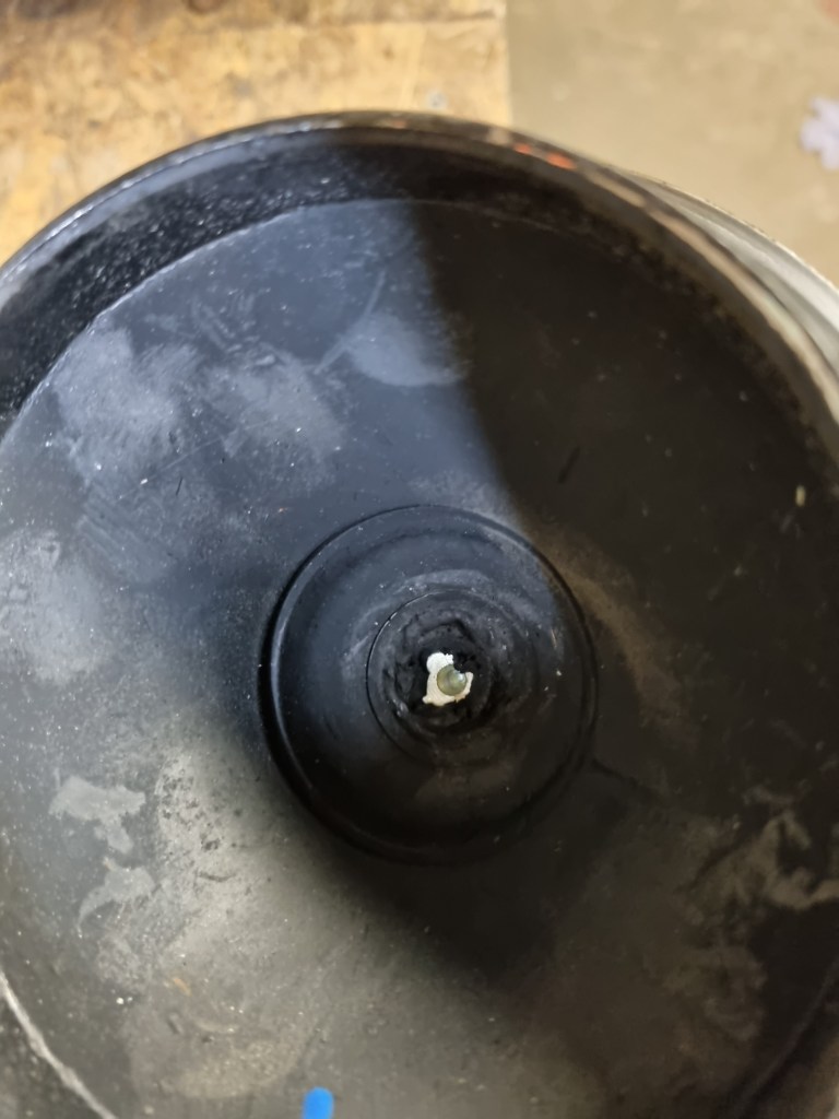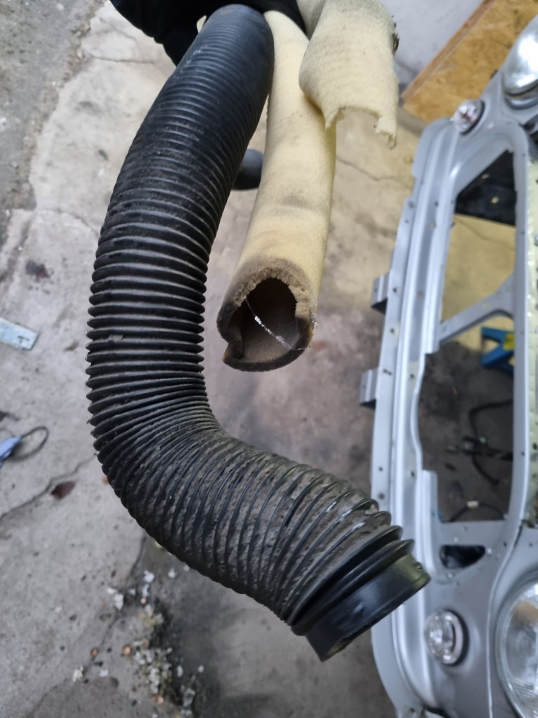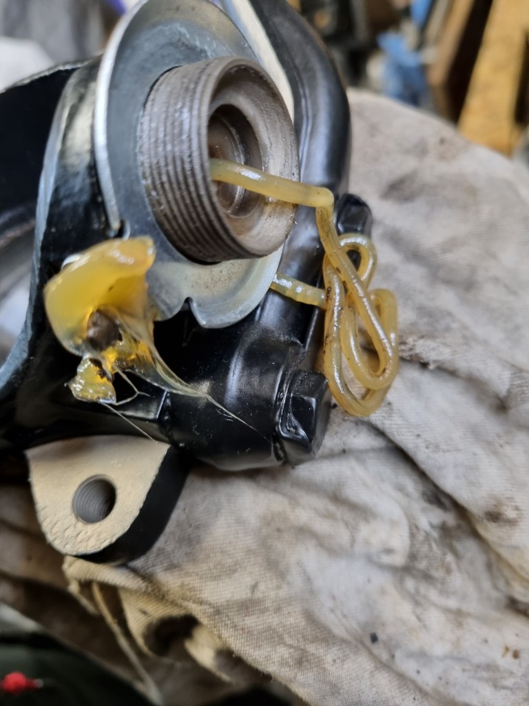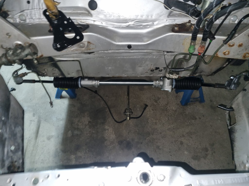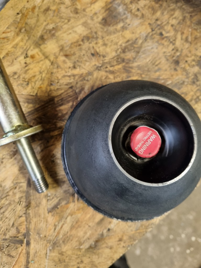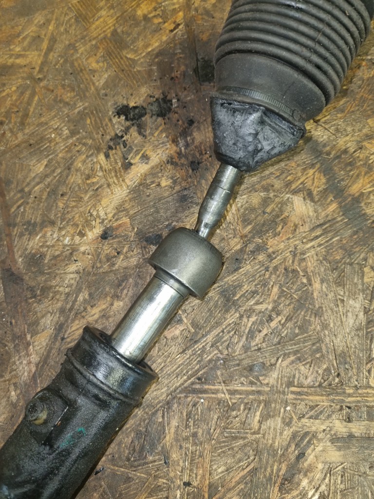 One thing that took more time is one of the new rubber cones. The metric compressor needs to be screwed into the cone from the top – but on one of the cones the necessary hole in the rubber was missing. Getting this cut turned out to be an unexpected 45min job – what a nightmare. But once this was done – I could move on to new steering rack. The old one has play and both inner tie rods are loose.