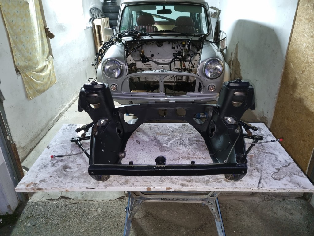 For the Mini I opted for a new rack. This costs 80GBP for an MPI Mini and was the suggested better way. As servicing and rebuilding the MGB steering racks (two LHD and one RHD rack) is on my task list – I might try my luck on the now obsolete Mini MPI rack as well. After installing the new rack, I put the subframe in – but then remembered that the Mini Sport delivery also contains new poly washers and bushes for the subframe.