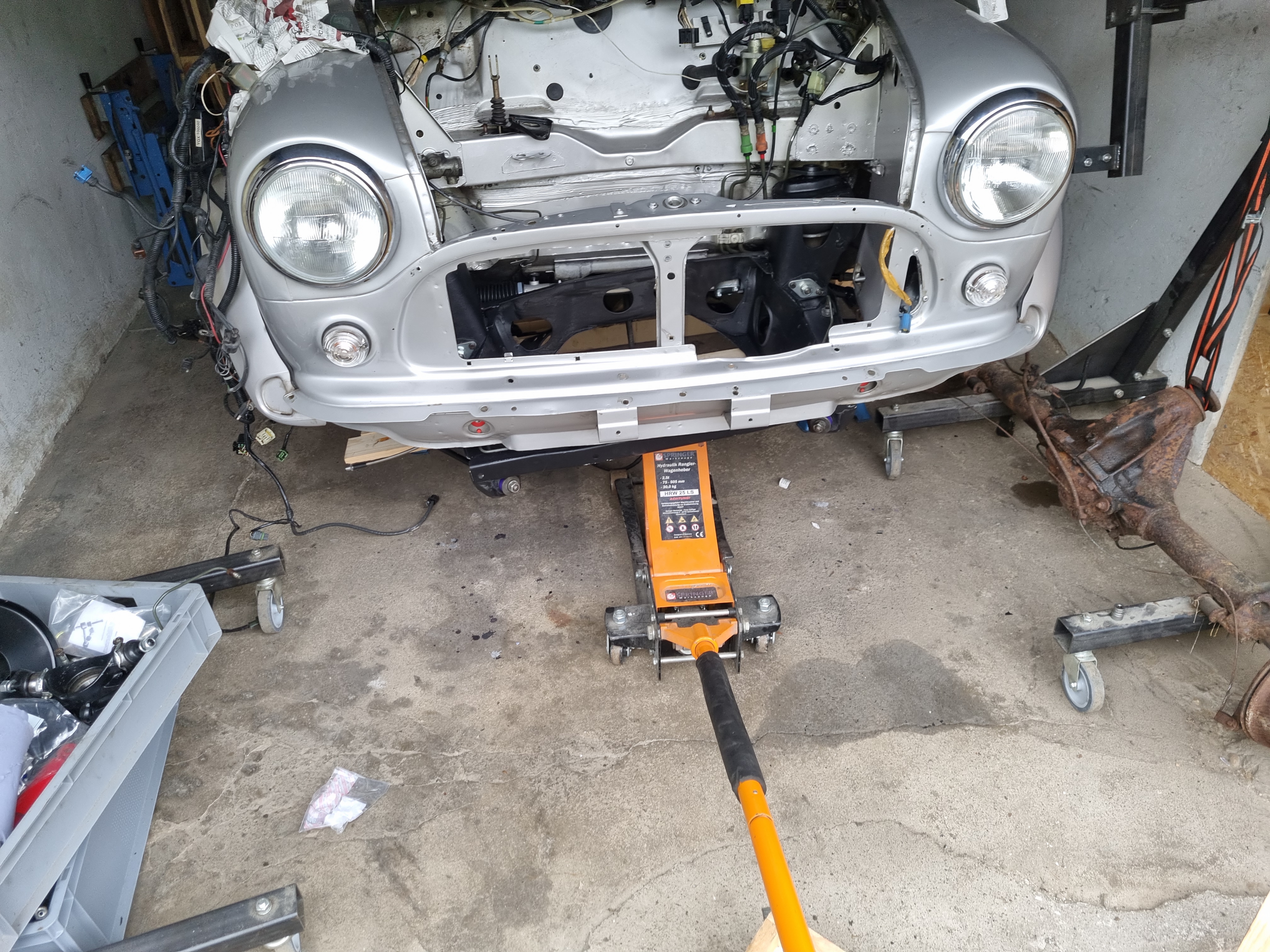 Storage space is also needed for a few rear axles, front crossmember and other items that don’t fit in a Euroboxes. But before I do this, I really need to get the Mini40 out of my garage. With almost all parts at hand – it was time to but start reassembly. The Mini engine bay got a thorough clean with nitro cleaner as well as some paint from the rattlecan. Using a wooden board beneath the front subframe made it dead simple to lift it into place with the trolley jack. New Poly bushes, washer and teardrops complete the overhauled subframe installation.