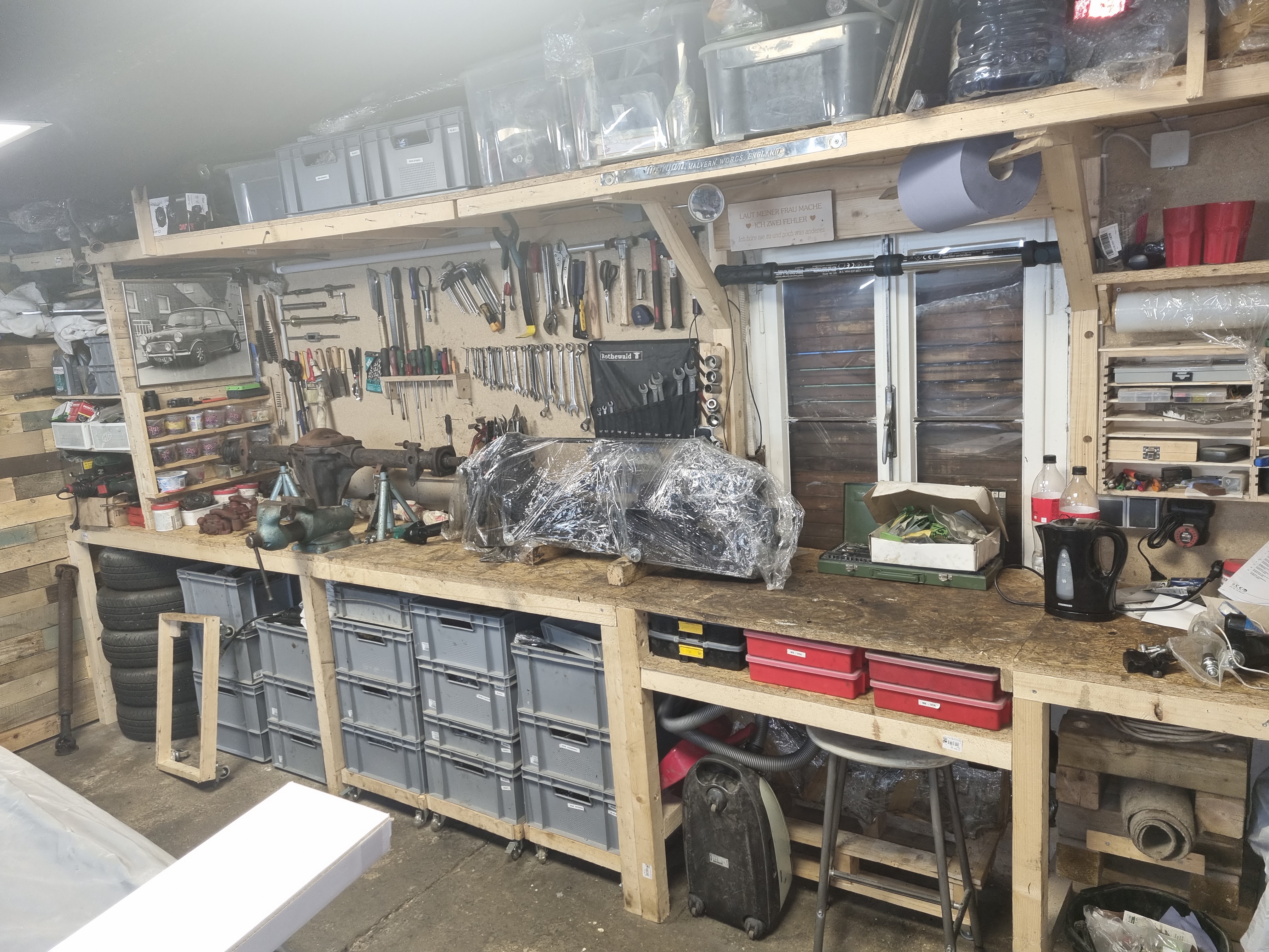 Talking about polishing: After doing this for a few hours – I decided to a) buy a stationary polishing wheel and b) reorganize my workbench to get parts like the quarterlights out of the way. Using an old pallet and some OSB cut-off pieces I had laying around – I build a ~60x60x110cm shelf at the very end of my workbench. This allows me to put the quarterlights away of now.