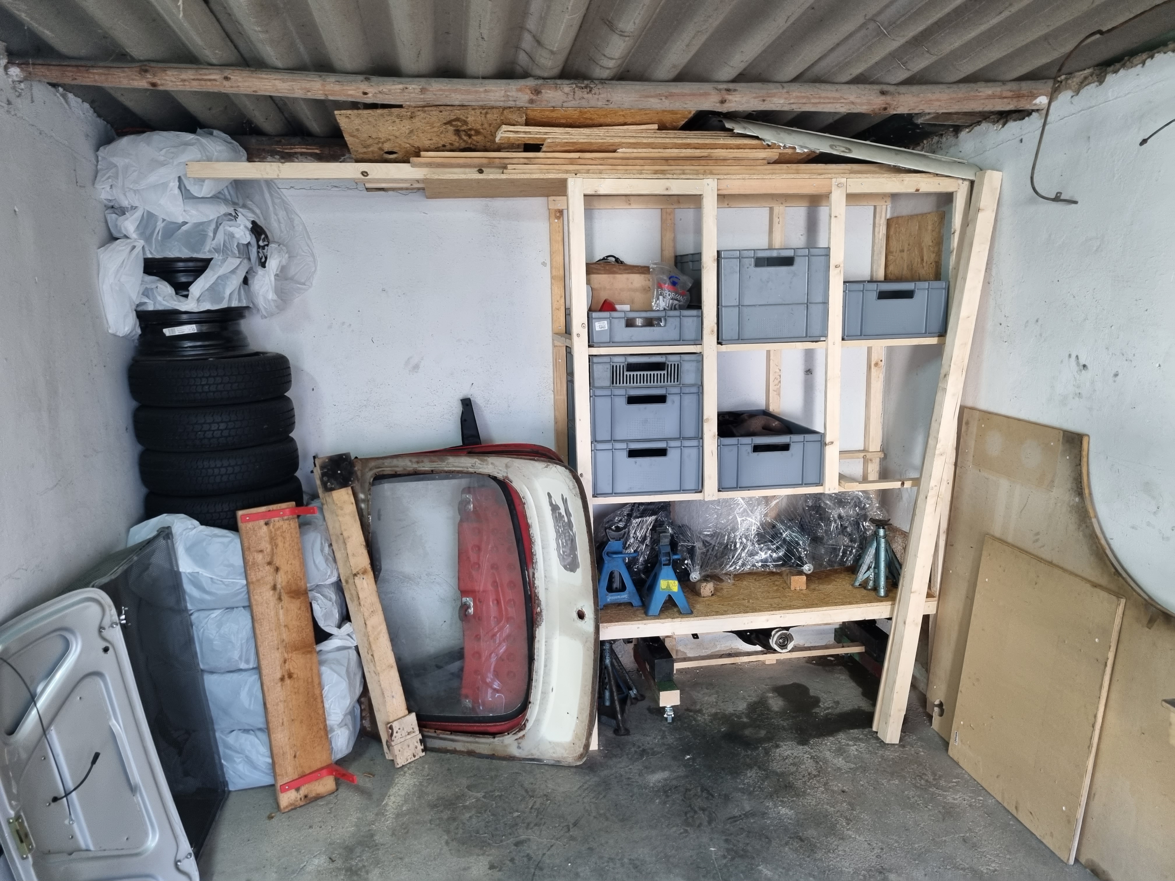 While the garage was empty at the beginning of the week – I decided to quickly build a shelf on the back wall of the second garage I have now. The plan is to store all finished and restored parts over there – mostly in Euroboxes. The Mini returned before I could complete both sides of the shelf. Changing the rear suspension trumpets with the HiLo’s is a quick and easy job on the Mini – especially as the fuel tank was still not back in completely (as the body work will be done next).