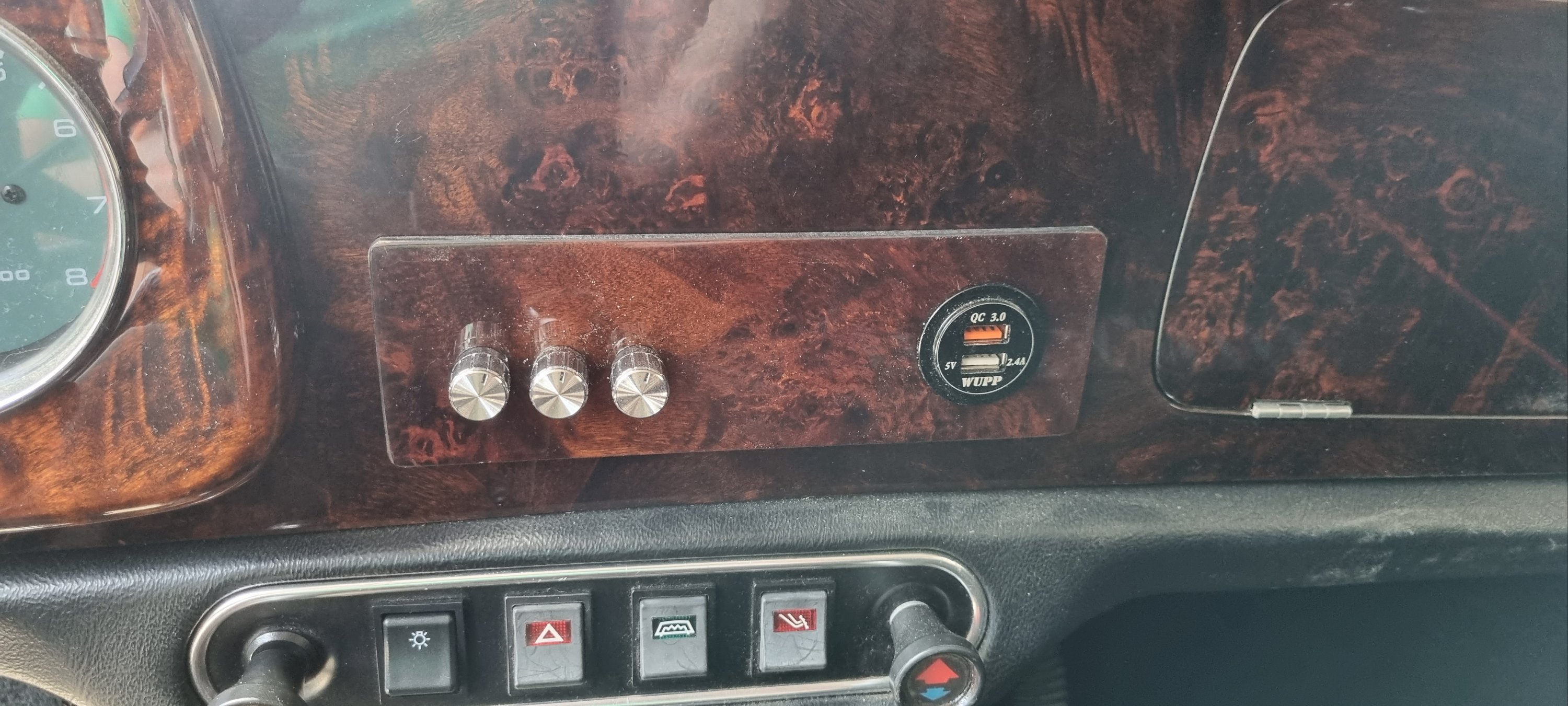 One task I never completed after the restoration was to nicely mount the Bluetooth receiver and USB port I got as a replacement for the old radio. The walnut dashboard came with a matching, wooden blanking cover. Three years ago I built my own cover from plywood and painted it black – but I never liked the look of it. Today I finally got my act together and replaced it.