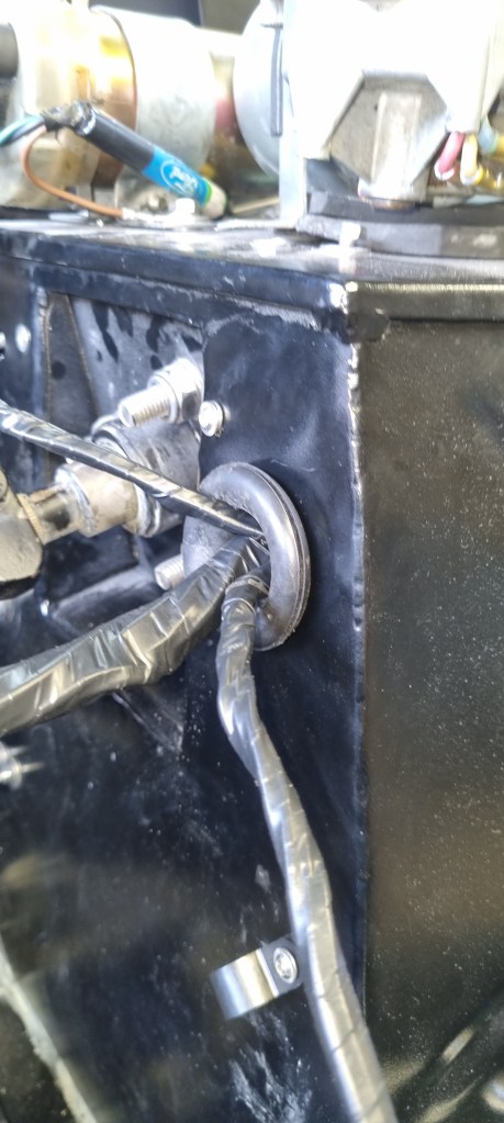 A few people commented that this doesn’t look convincing. And when I tried to fit and tested everything (before wrapping the entire loom with tape) I came to the same conclusion. With the new under-scuttle-antiroll bar, the two metal bars brought the PDB too close. The cover touched the rollbar and the risk of a short circuit due to vibration was too high. And the slightly changed cable routing moved the entire loom about 5cm up on the bulkhead – which resulted that all connections in the engine bay were 5cm too short.