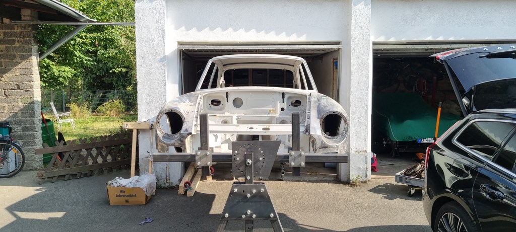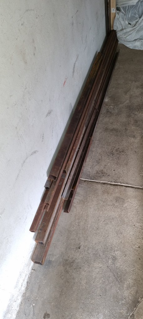 This was quite a productive weekend. On Saturday I woke up early because I could not get a thought out of my head. Last week, when I built the metal crossmember for the Mini seats, I fetched a single piece of square tube from a metal bin. But there was quite a bit more in the container. This was all metal that was in Stephan’s workshop during the fire back last December. It has surface rust but should be OK for a proper bodyshell dolly. A project that is on my backlog for quite some time – and for whatever reason I suddenly had the urge to get this done.