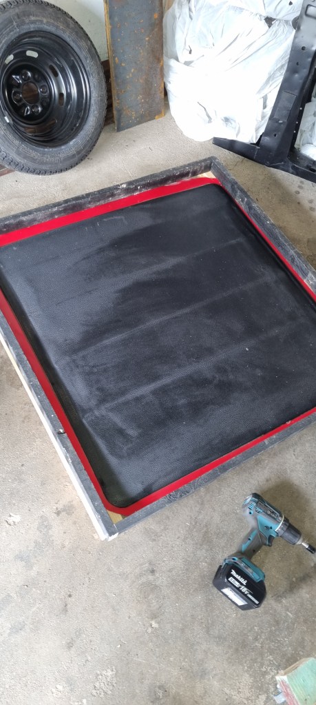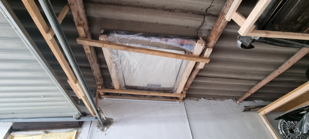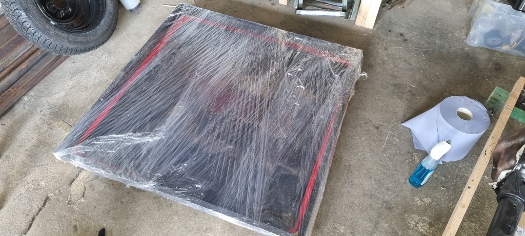 Getting the stuff out took quite a bit of time – as it was at the bottom of the container. After storing approx. 10m of square tube in diverse sizes back in my garage the rest of the day was dedicated to gardening and building an additional firewood shelf. While at it, I also cut some old roof slats to length intended as protective frame for a Britax sunroof I bought a while ago. Somebody cut the whole thing cut out of a roof and there is still some sharp metal around. I cleaned the vinyl, screwed the metal to the slats and added the rest of two beams from the firewood shelf to protect the plastic wind deflector.