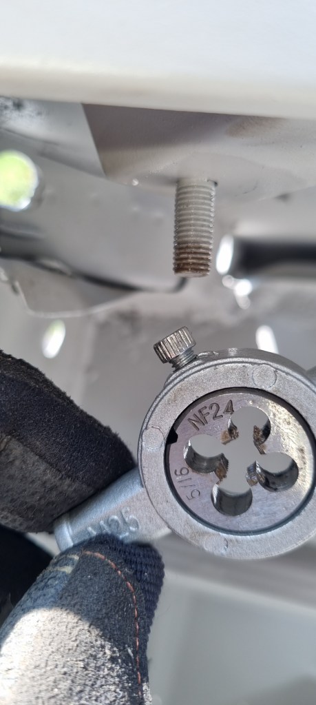 With a pair of MGB front wings as well as a LHD dashboard were in my way. This reminded me that I must tap and die all nuts and bolts on the MGB bodyshell. The outer to bolts for the dashboard were OK, but the center bolt is slightly bend. I could only rethread is up to the middle. The workaround for this is adding four washers – replacing this bolt would be fiddly. I tapped all holes in the front of the car for 1/2″ and 7/16″ bolts. Unfortunately, there are at least 15 broken bolts that need to be drilled out – I marked all spots that need attention with small pieces of tape…